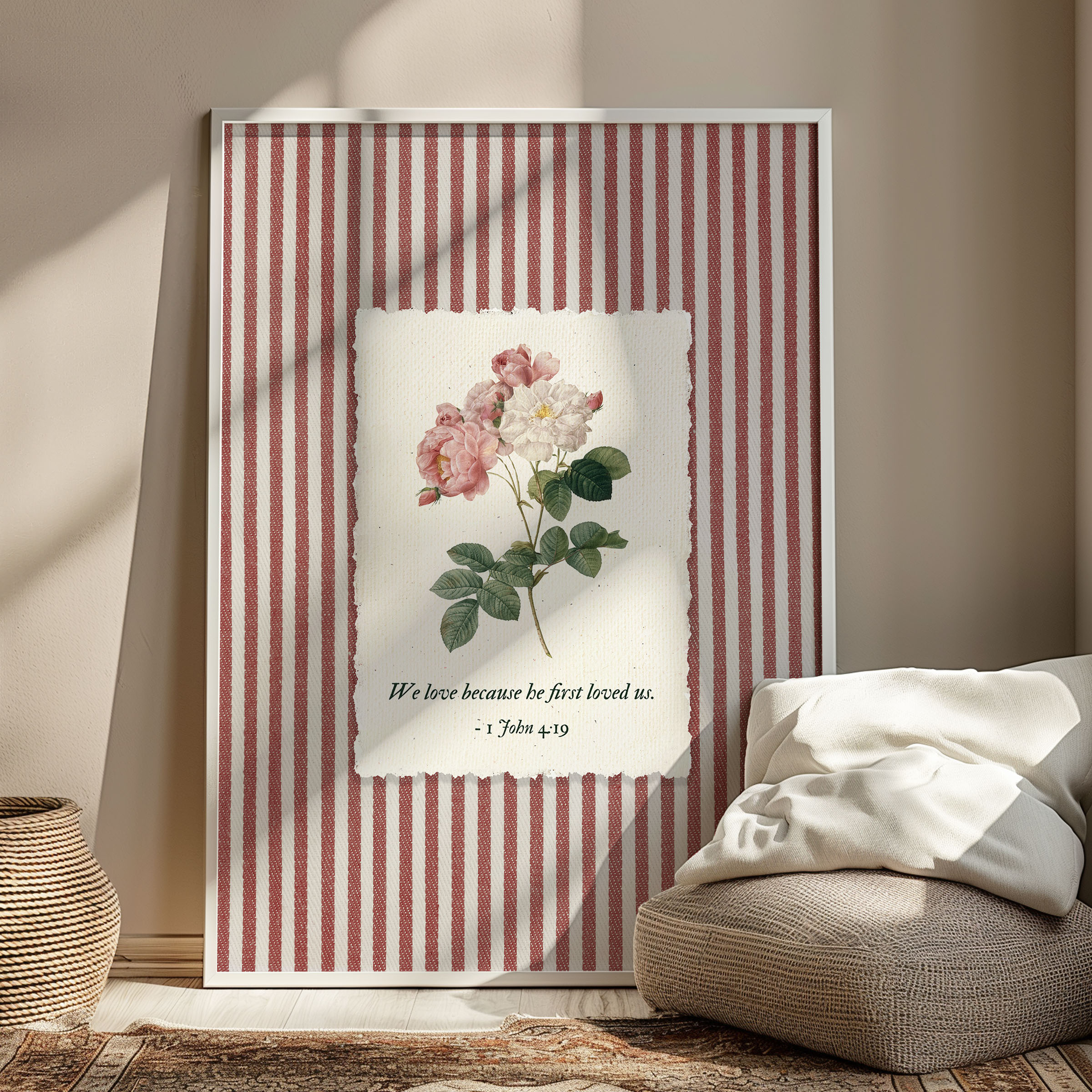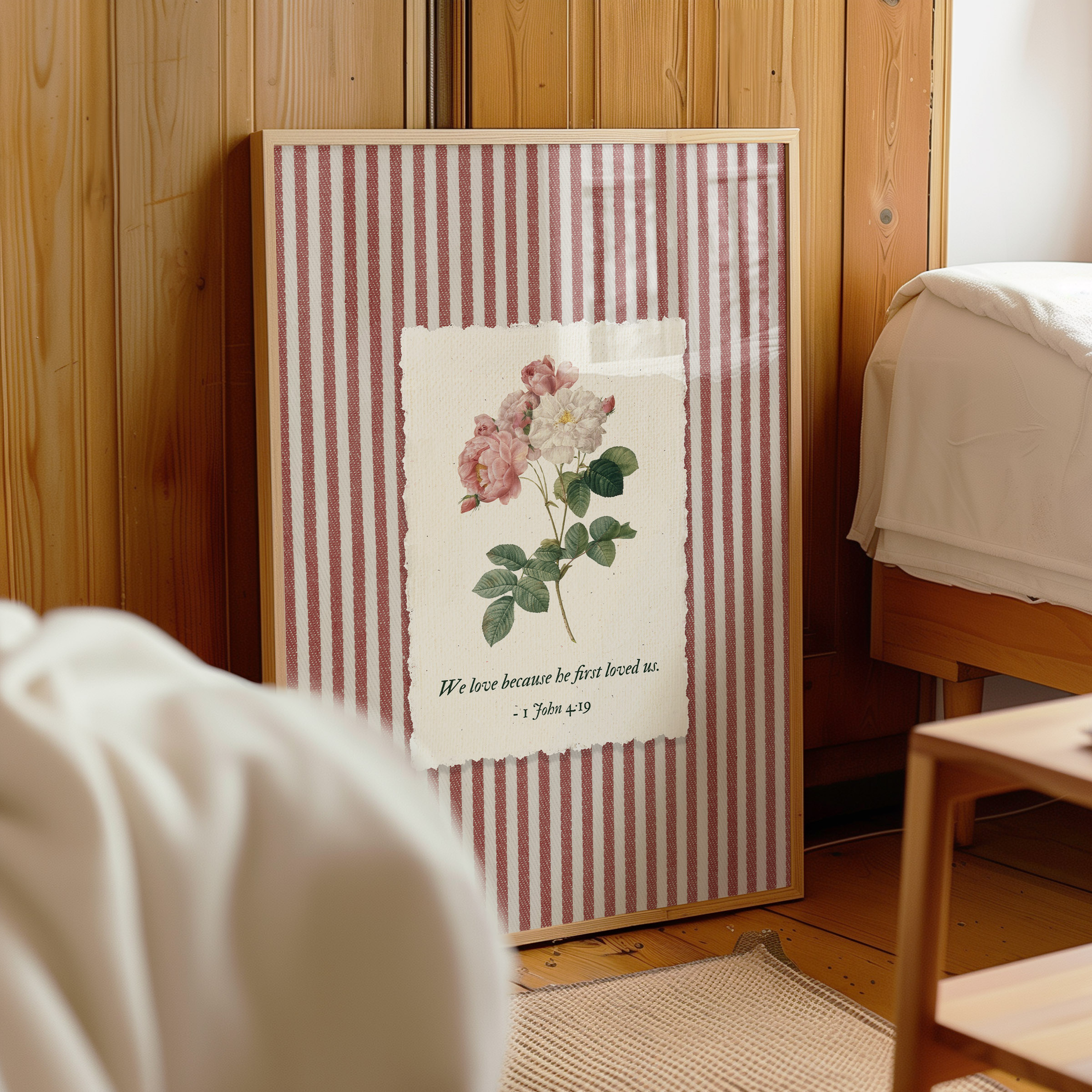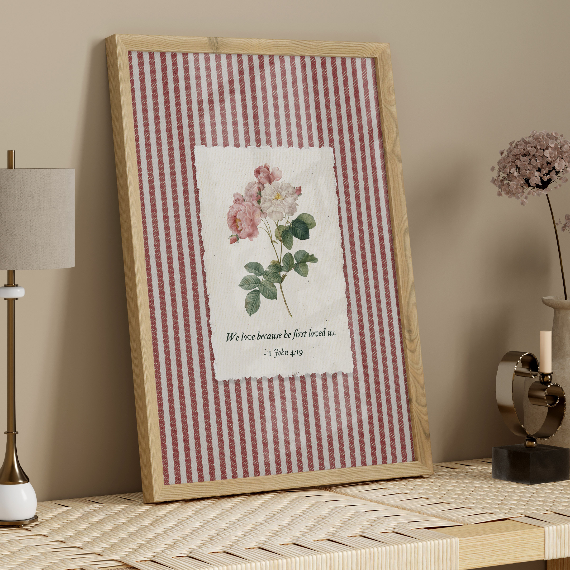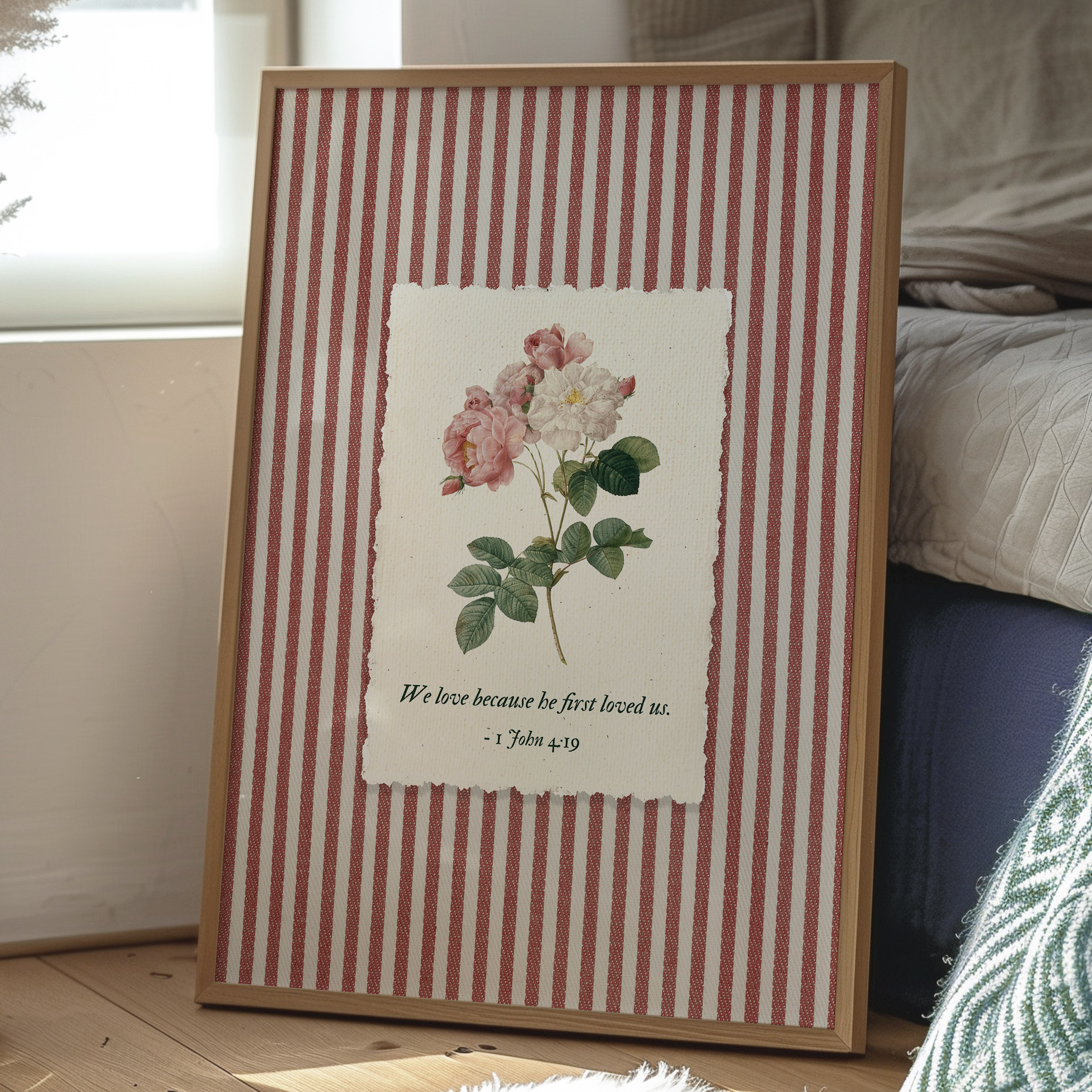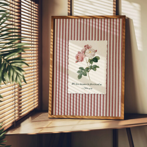 Inspired by 1 John 4:19 — We love because He first loved us, this artwork reflects the foundation of Christian faith: love that begins with God. A soft rose botanical illustration rests on a striped background, blending Scripture with a gentle, nostalgic aesthetic. This piece was created as Bible verse wall art that feels personal, comforting, and deeply meaningful.