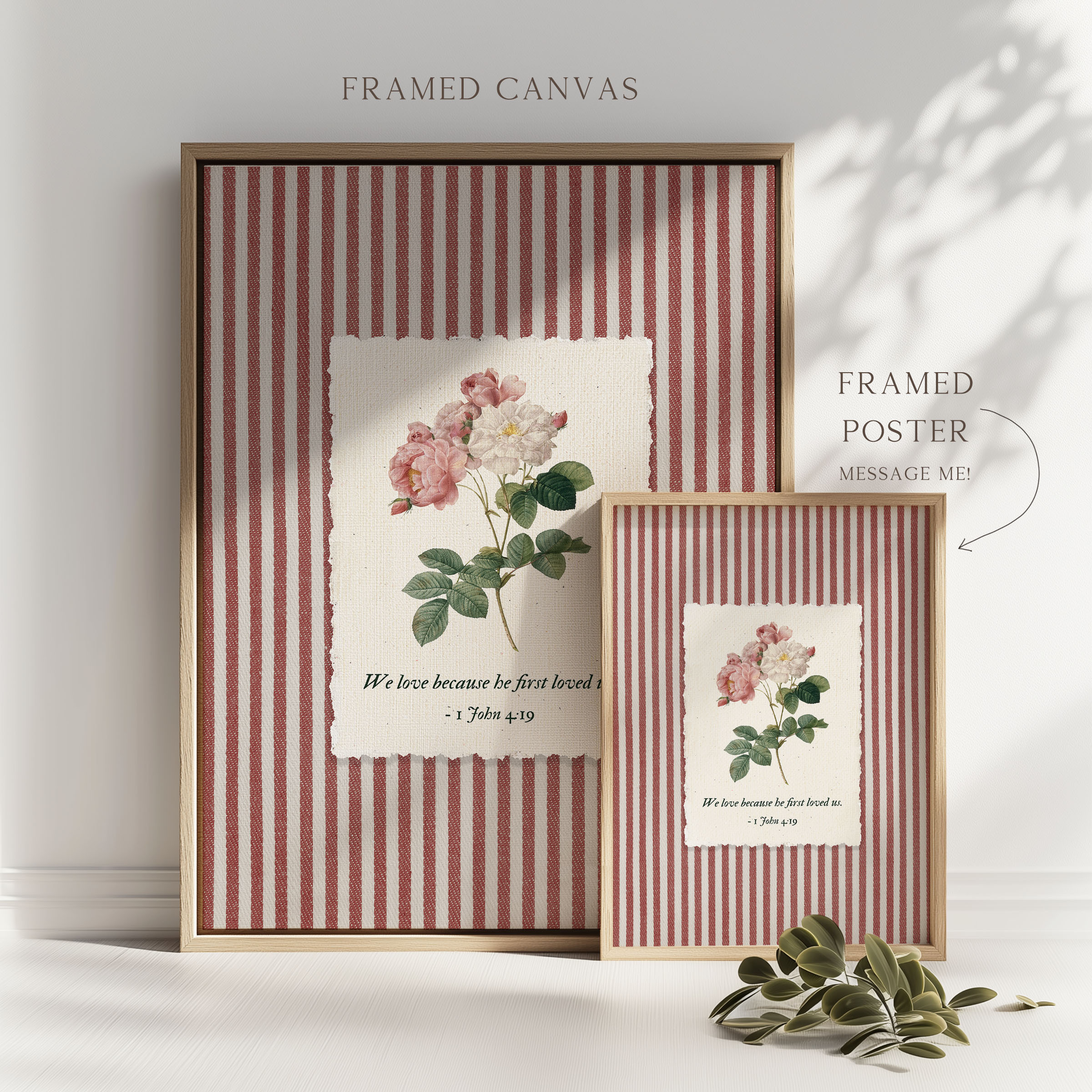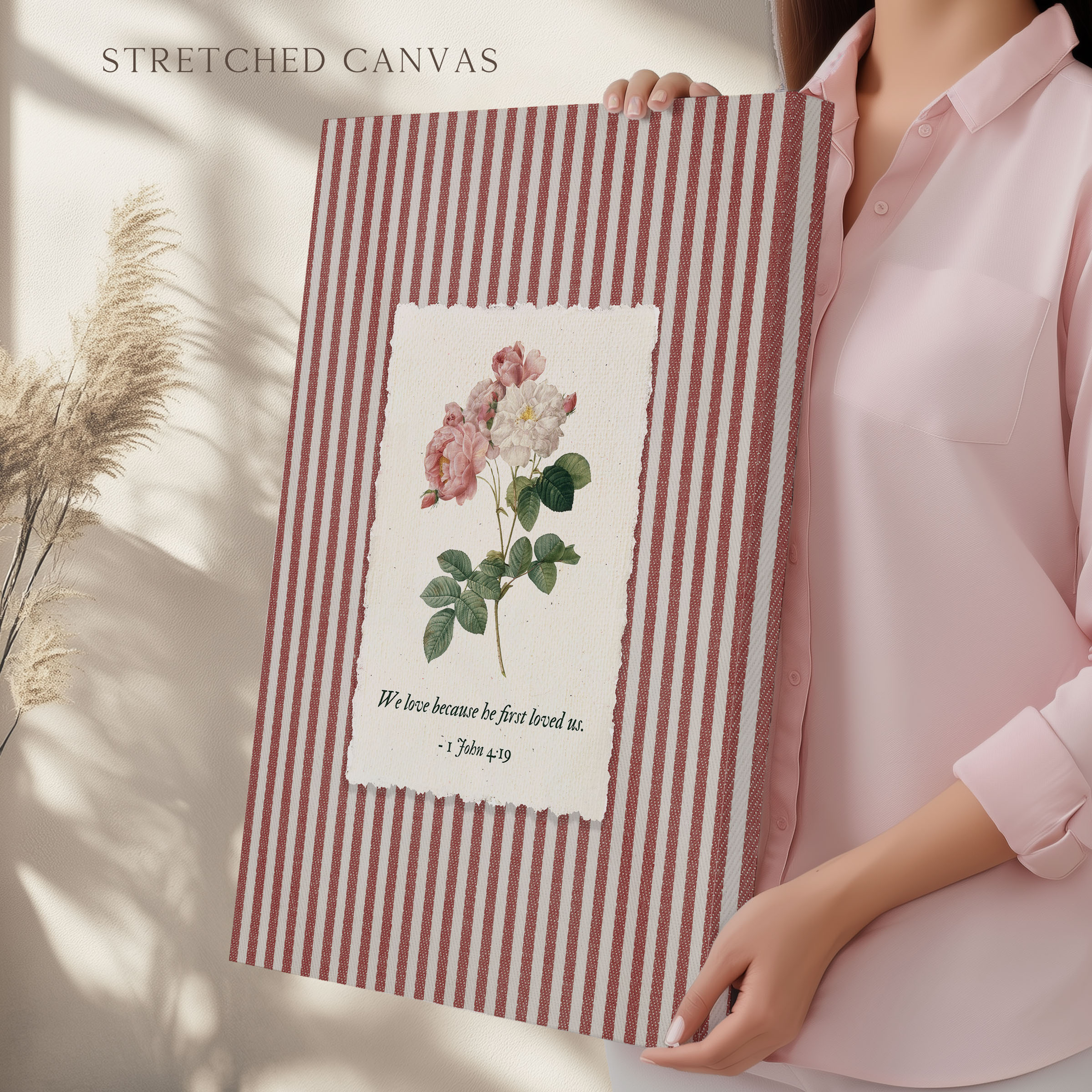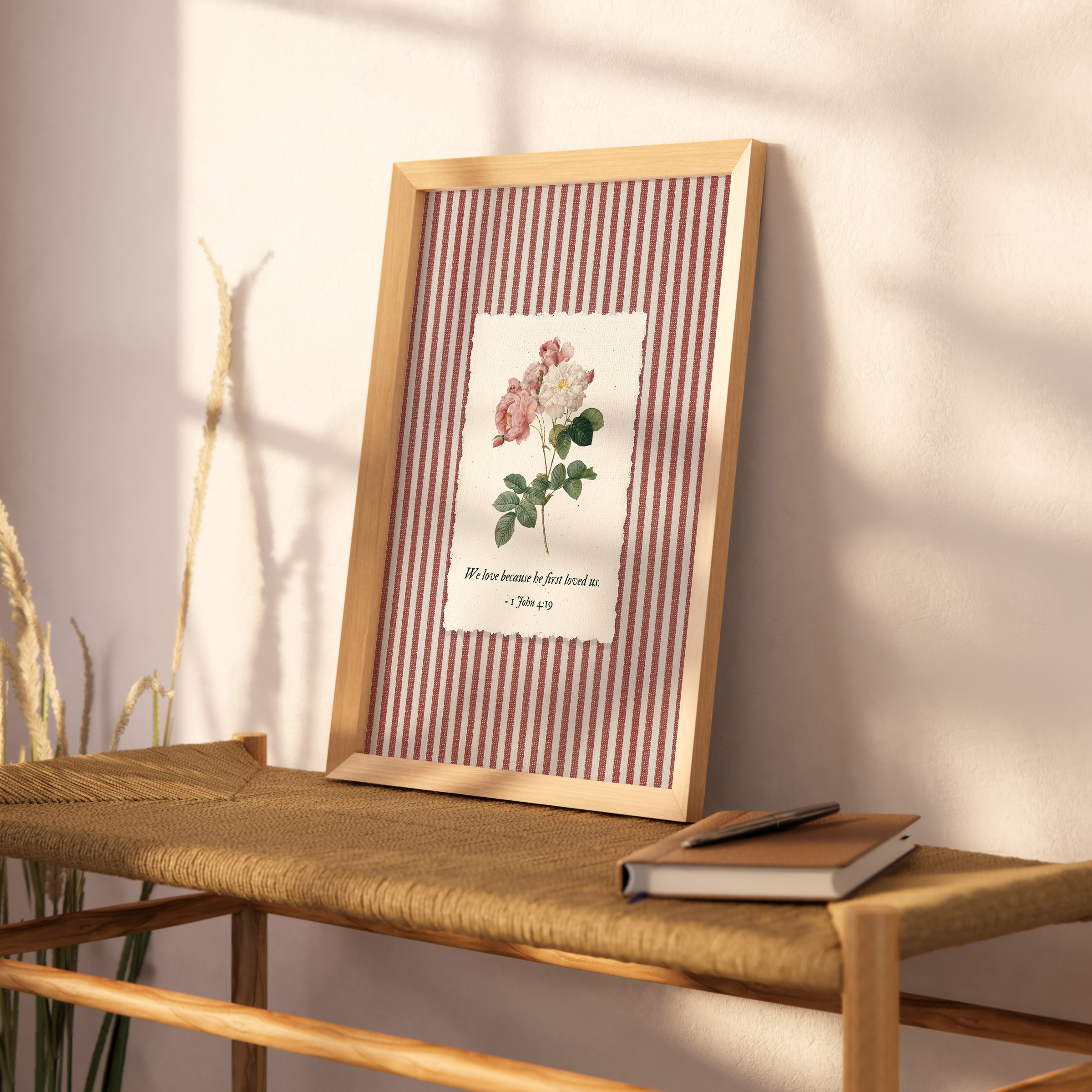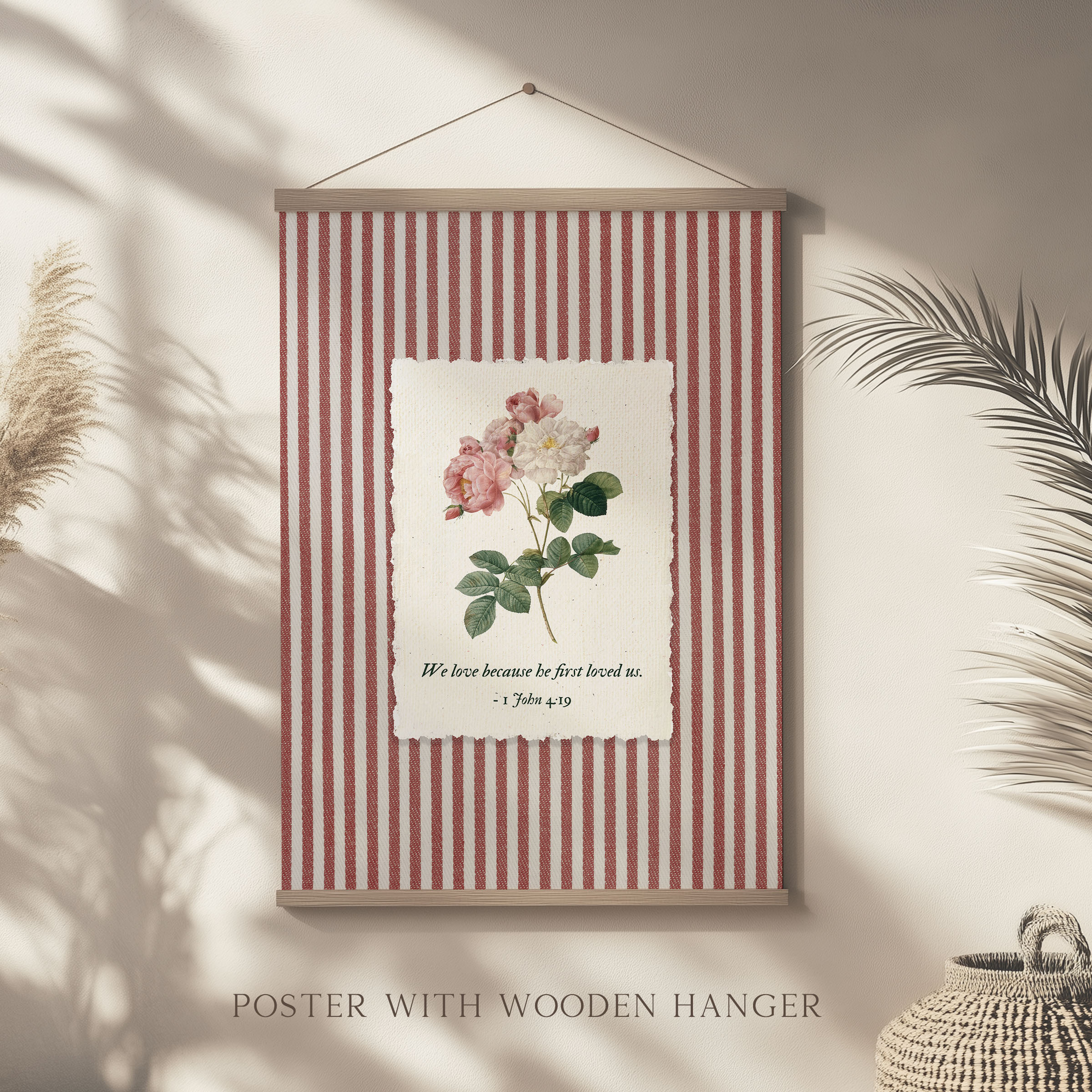 Inspired by 1 John 4:19 — We love because He first loved us, this artwork reflects the foundation of Christian faith: love that begins with God. A soft rose botanical illustration rests on a striped background, blending Scripture with a gentle, nostalgic aesthetic. This piece was created as Bible verse wall art that feels personal, comforting, and deeply meaningful.
