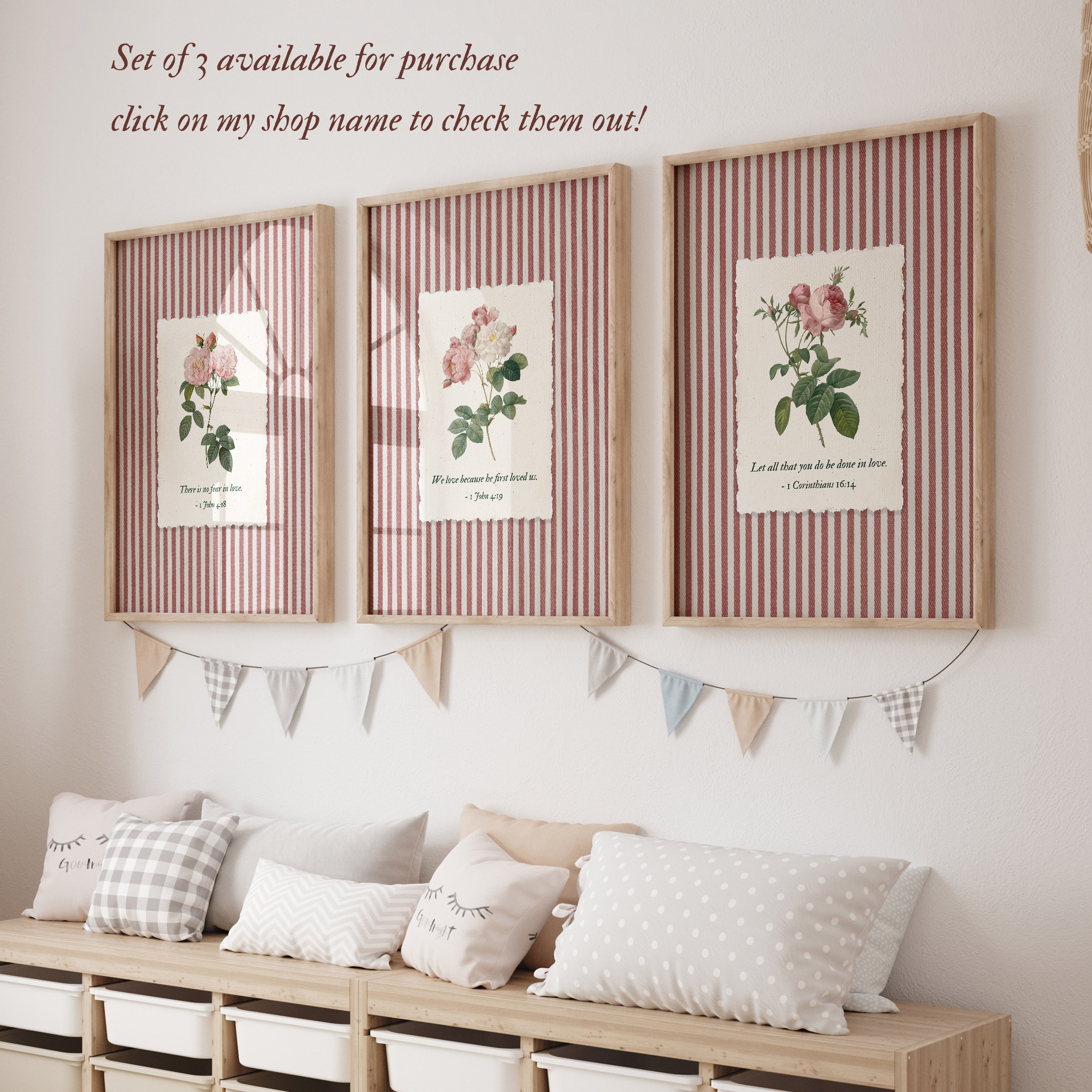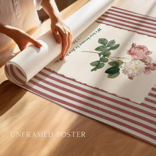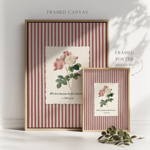 With its vintage cottage core and pink red shabby chic palette, this 1 John 4:19 Bible Verse Wall Art fits effortlessly into bedrooms, nurseries, prayer corners, and living spaces. It also works beautifully as scripture home decor for weddings, anniversaries, or Valentine’s Day faith displays. The striped design makes it especially well suited for stripe poster canvas formats, framed or unframed.