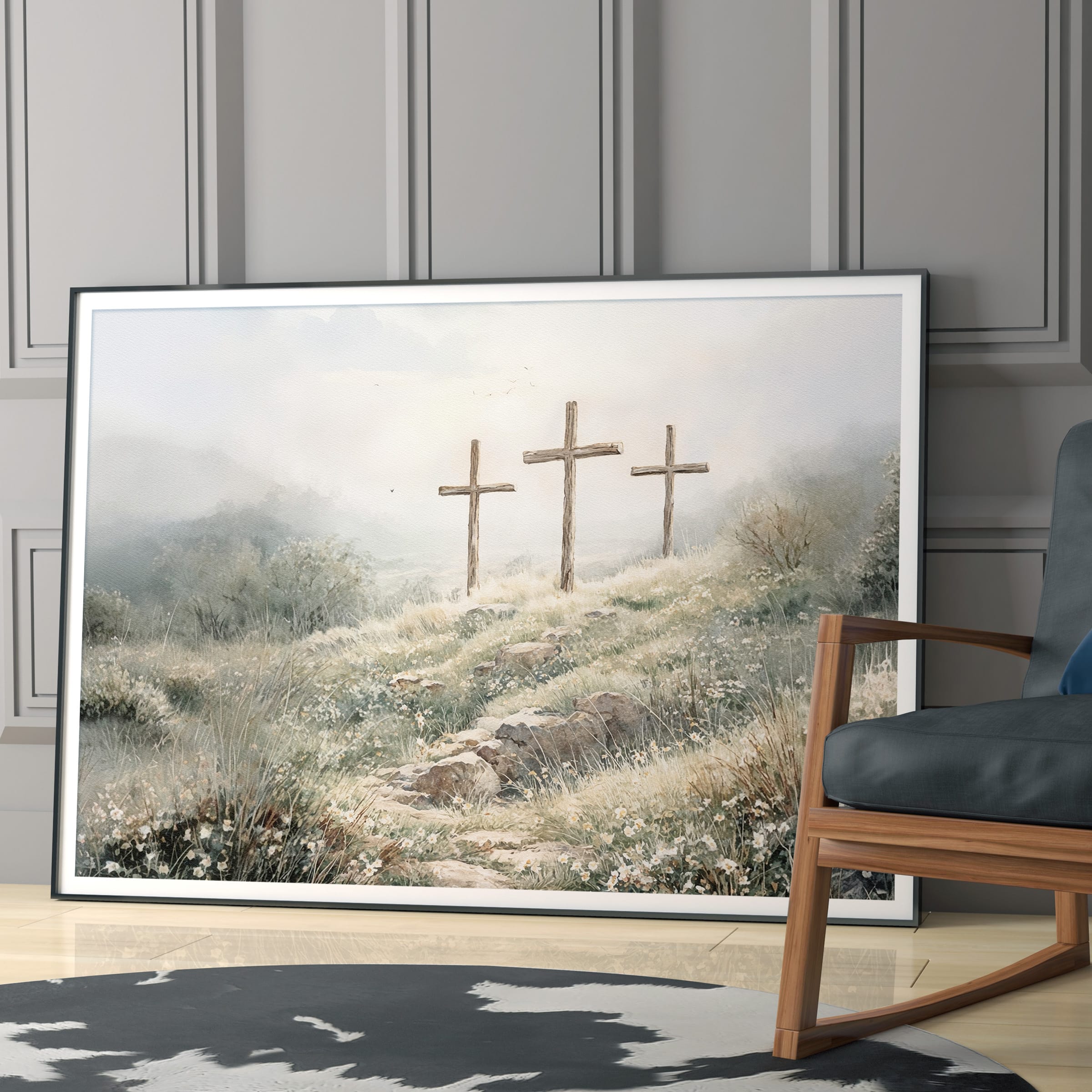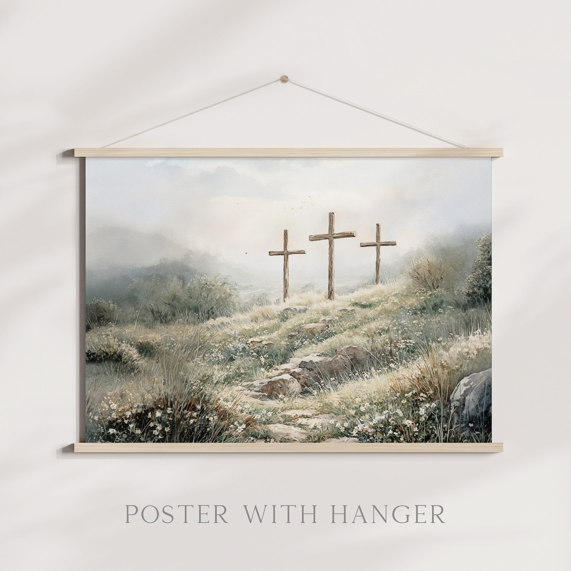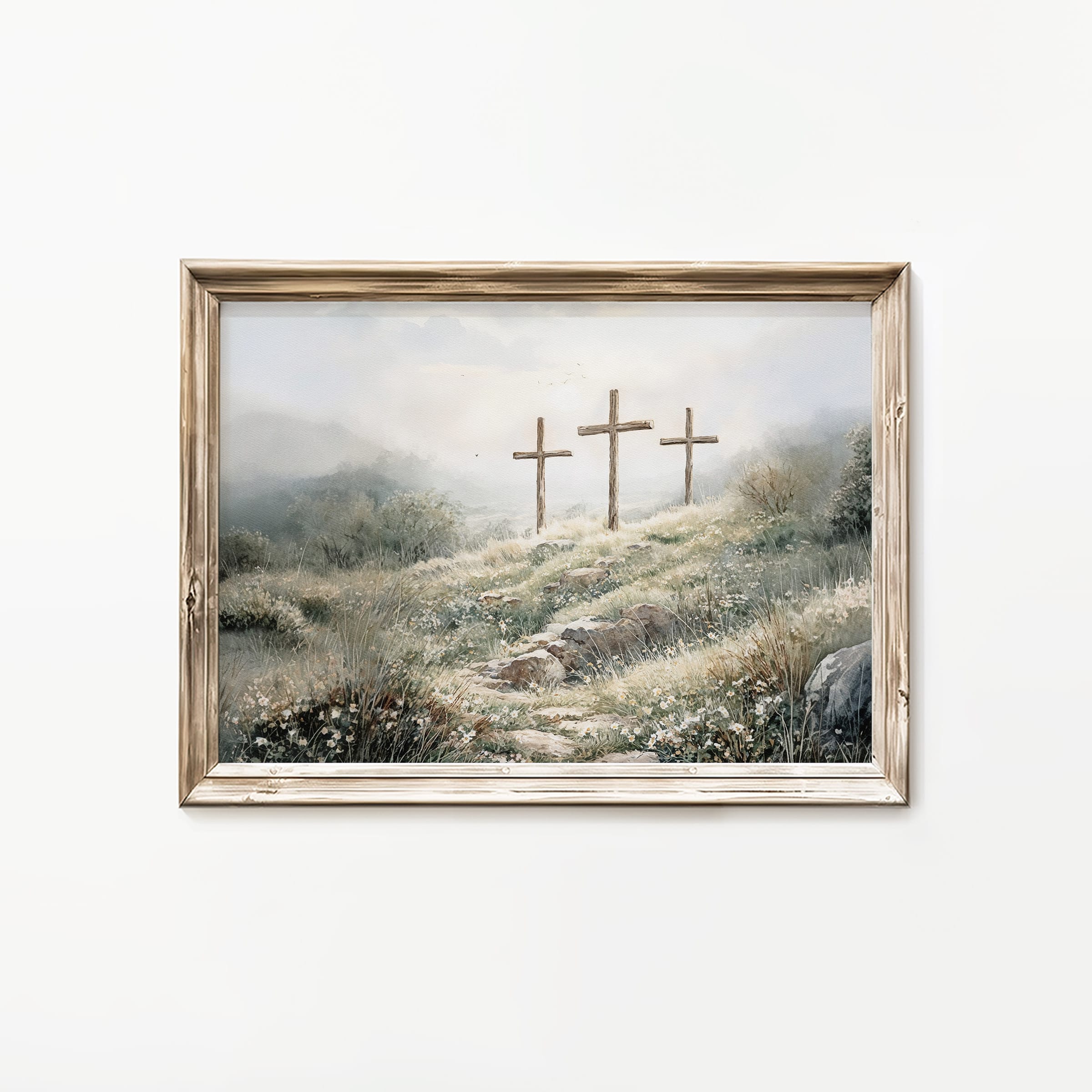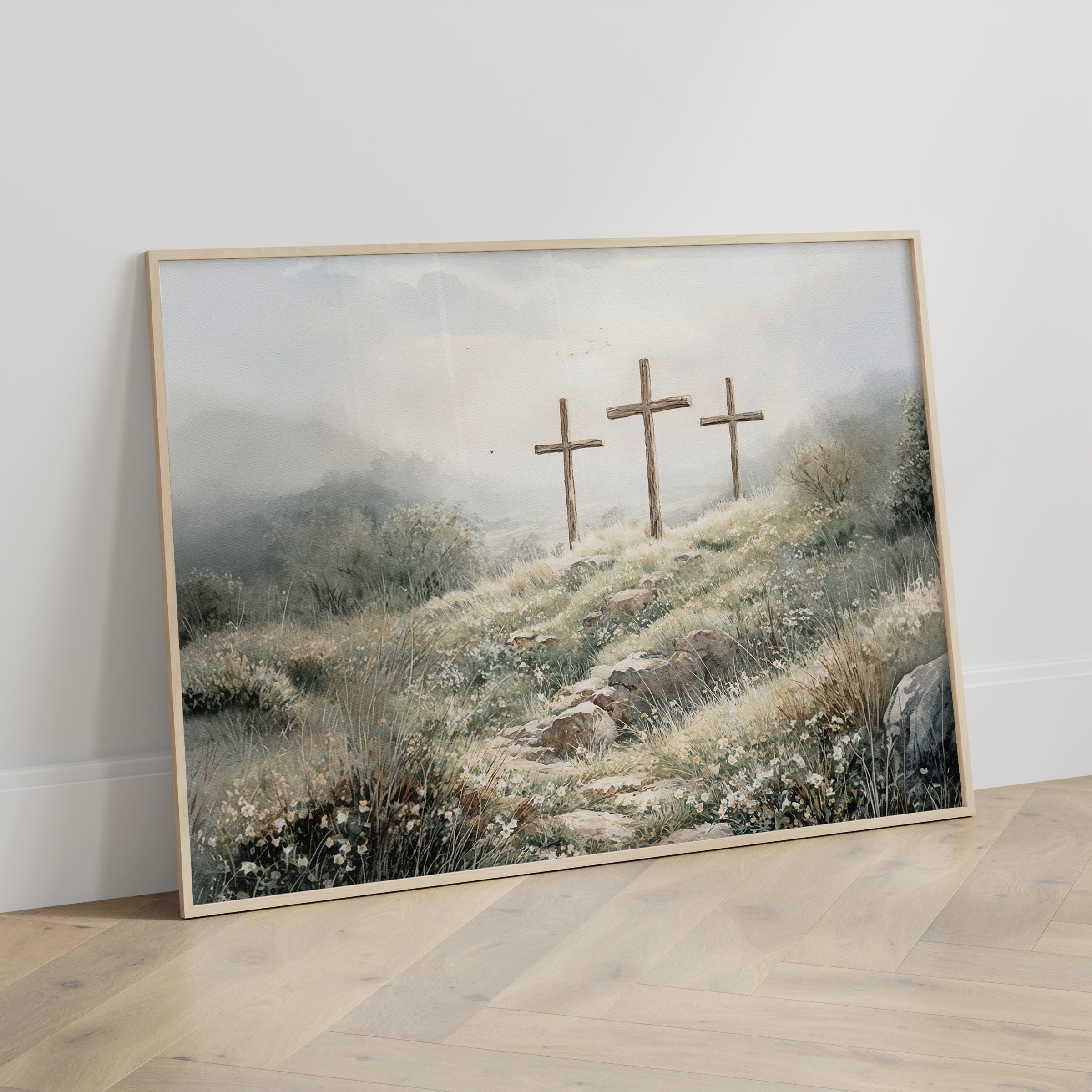 3 crosses design Christian wall art in a soft watercolor landscape. A timeless religious decoration symbolizing faith, sacrifice, and Easter reflection.