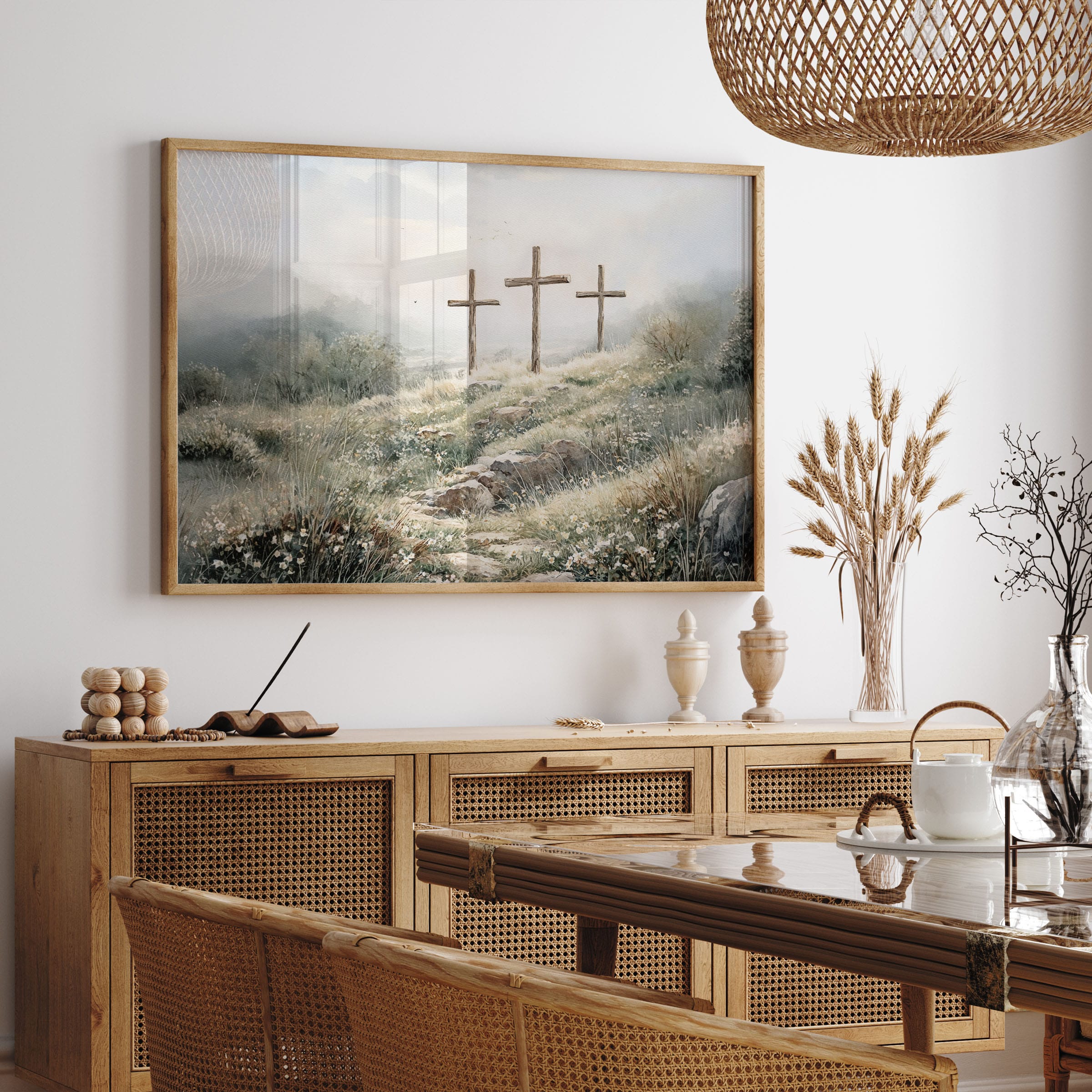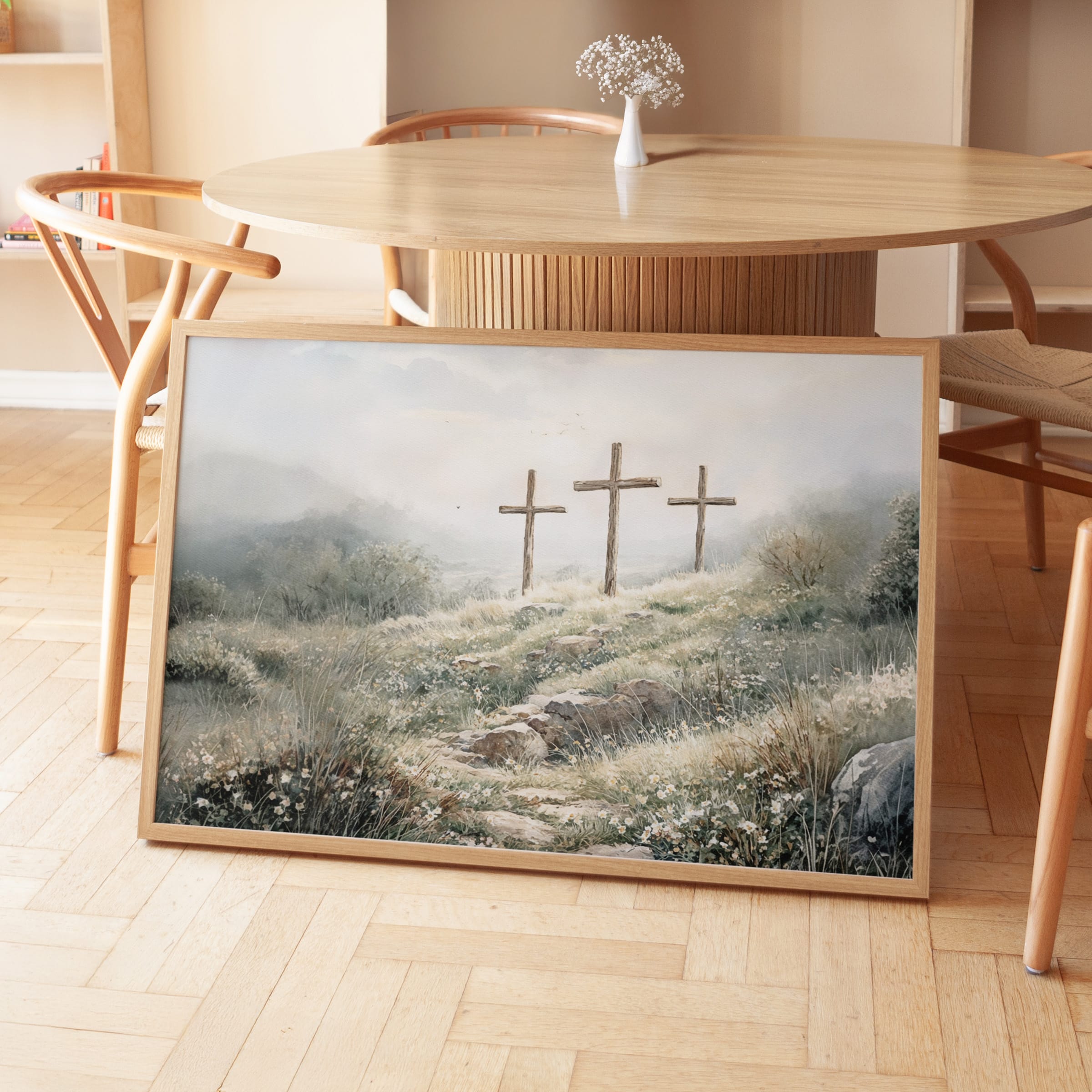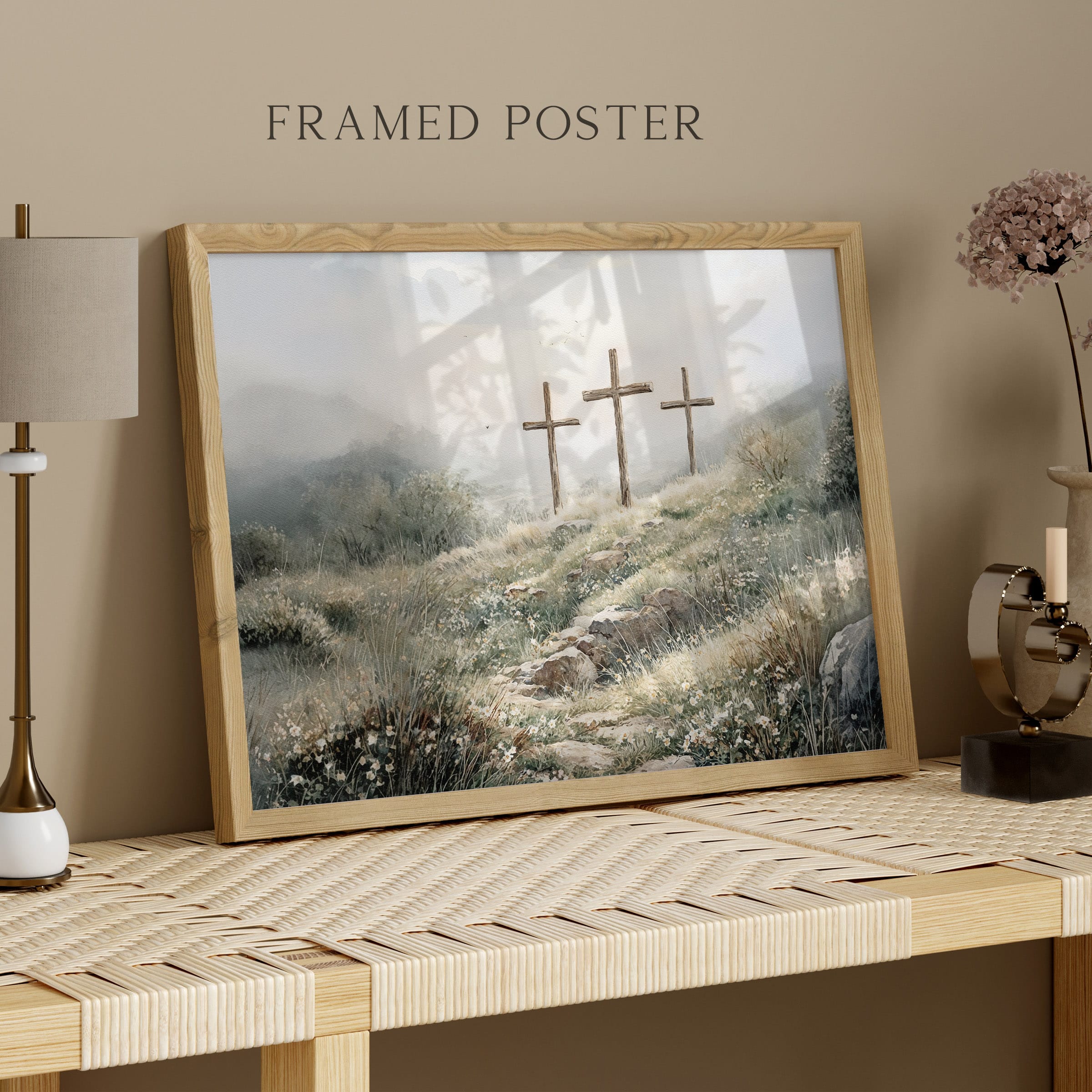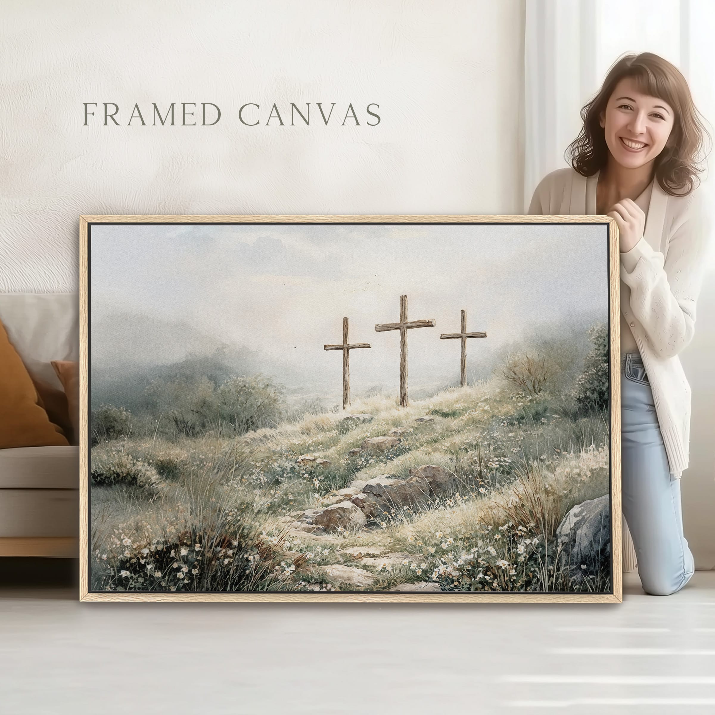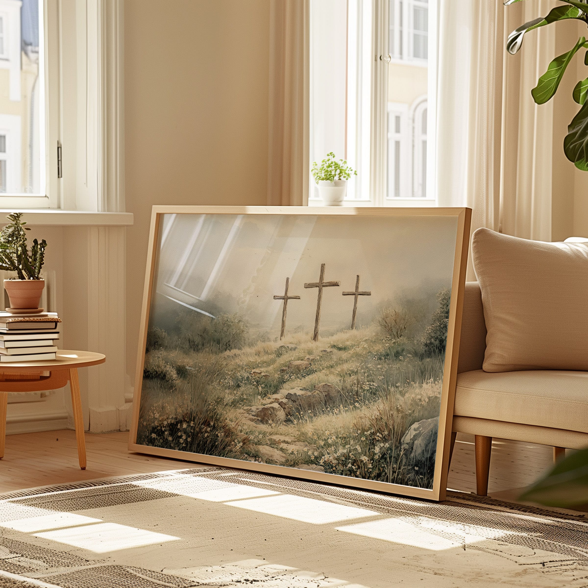 3 crosses design Christian wall art in a soft watercolor landscape. A timeless religious decoration symbolizing faith, sacrifice, and Easter reflection.