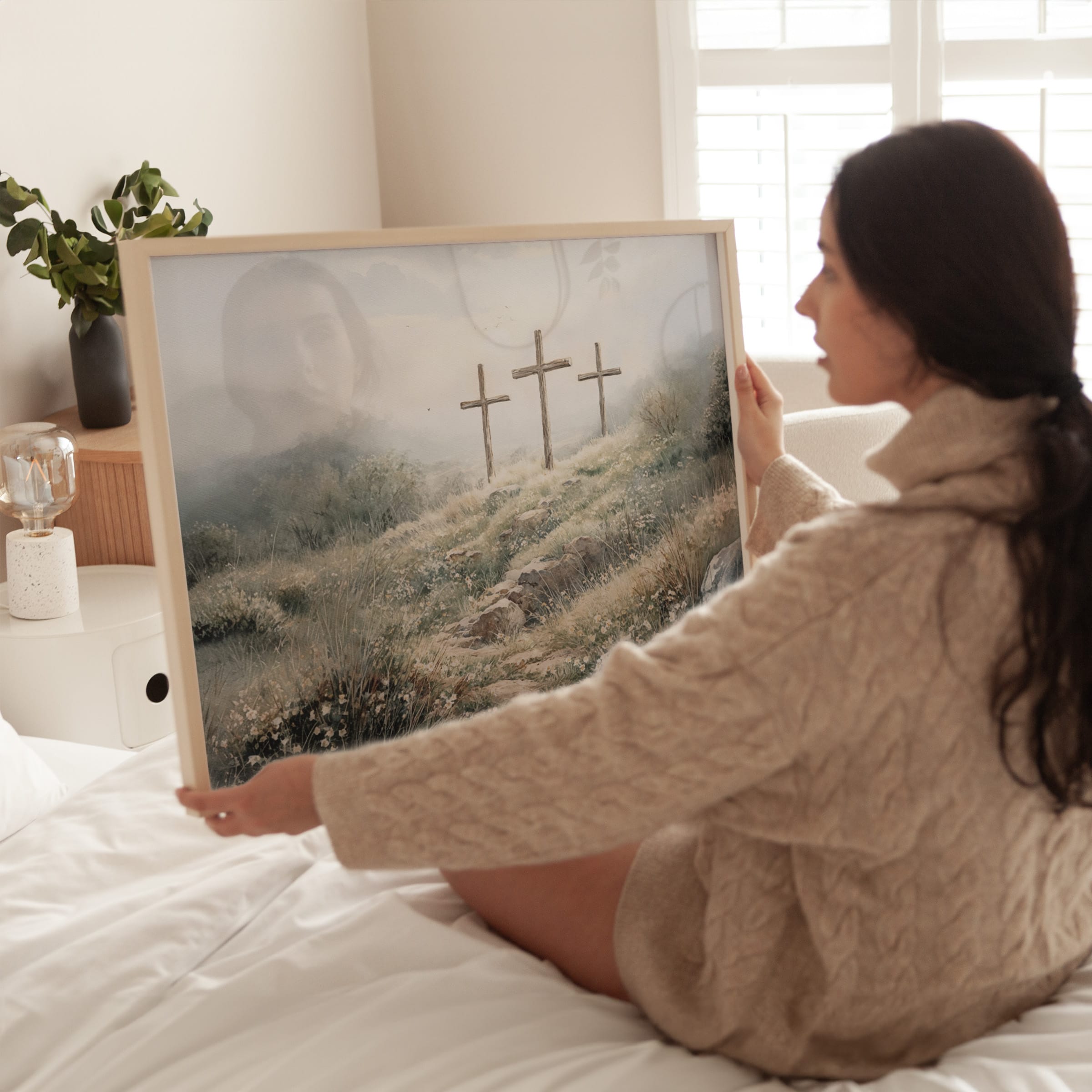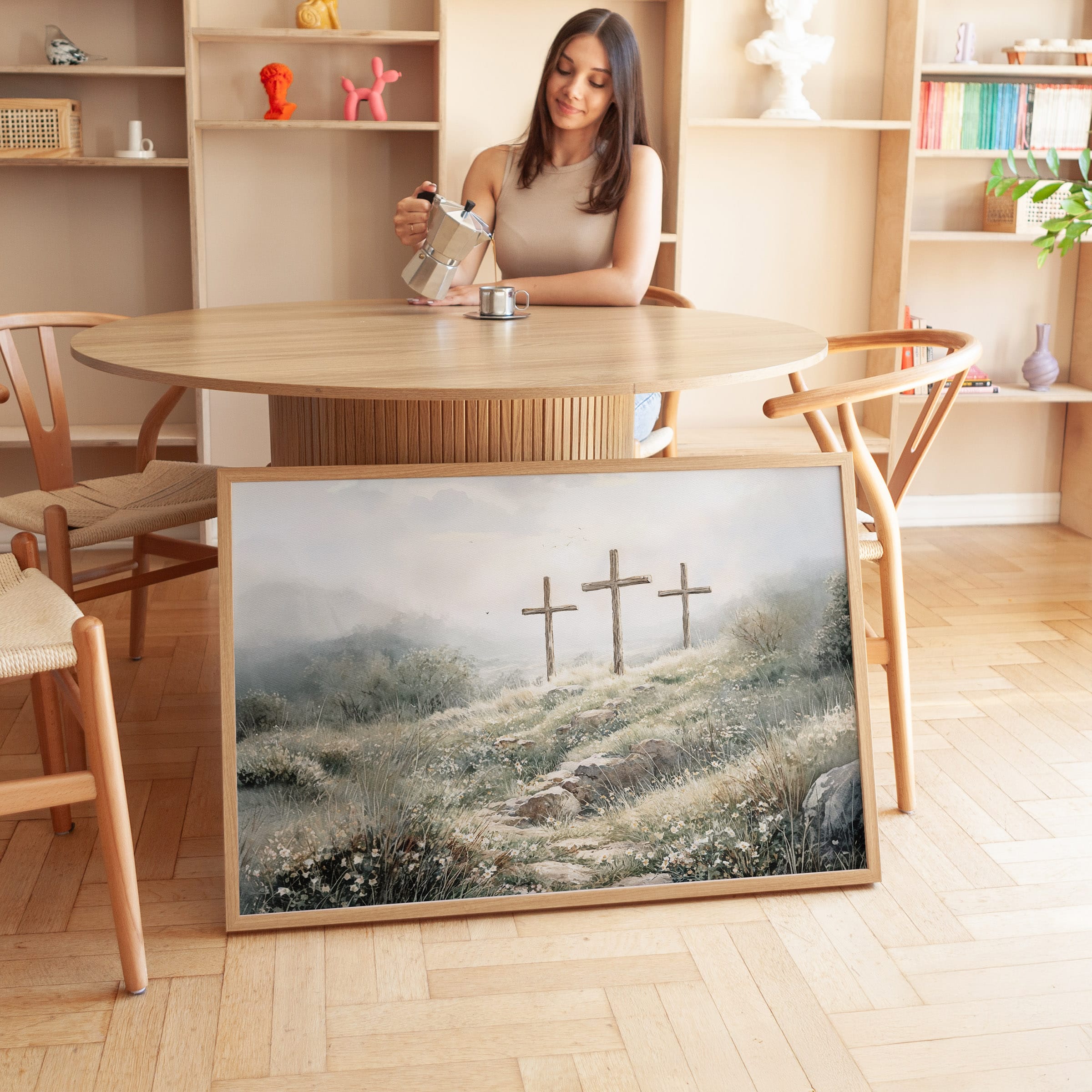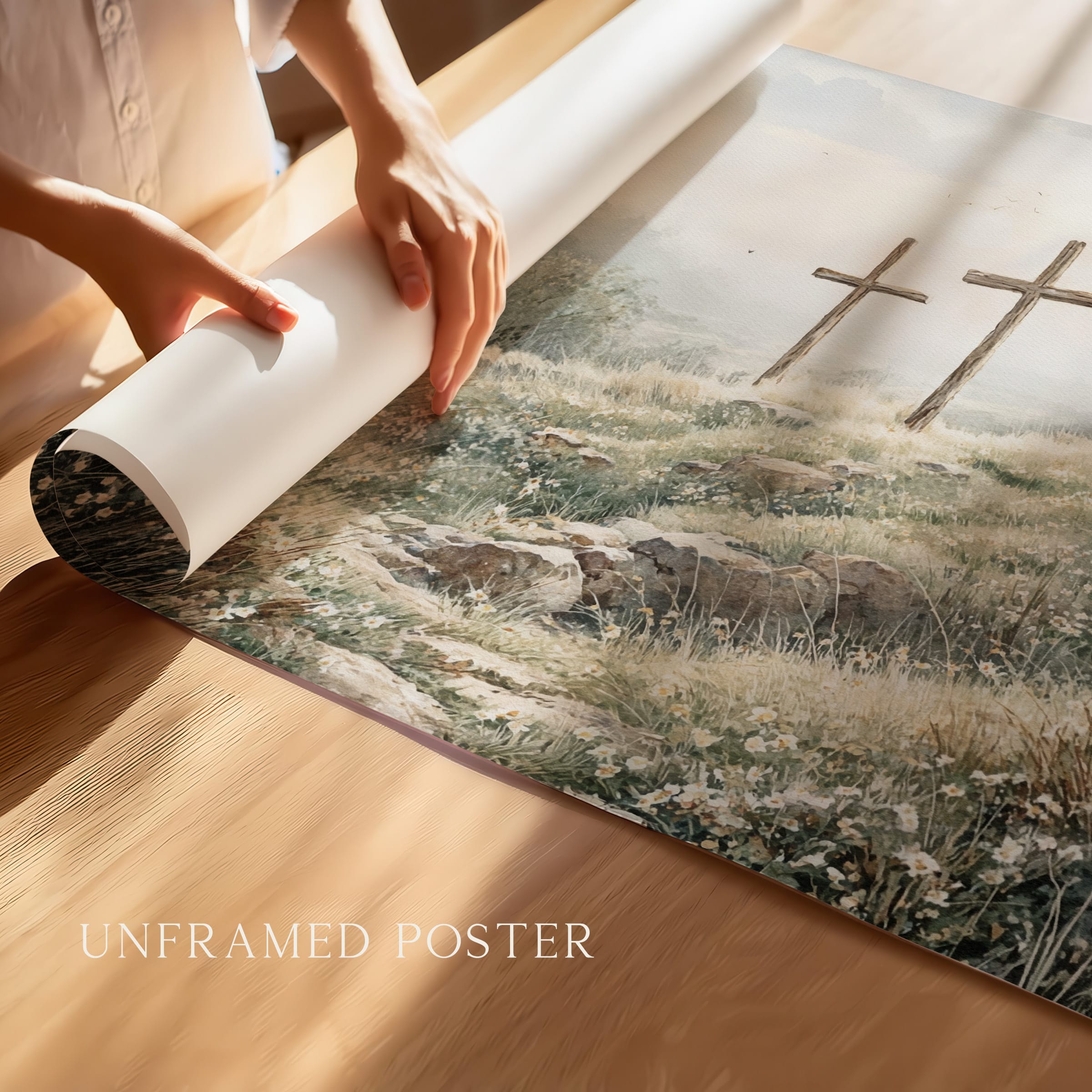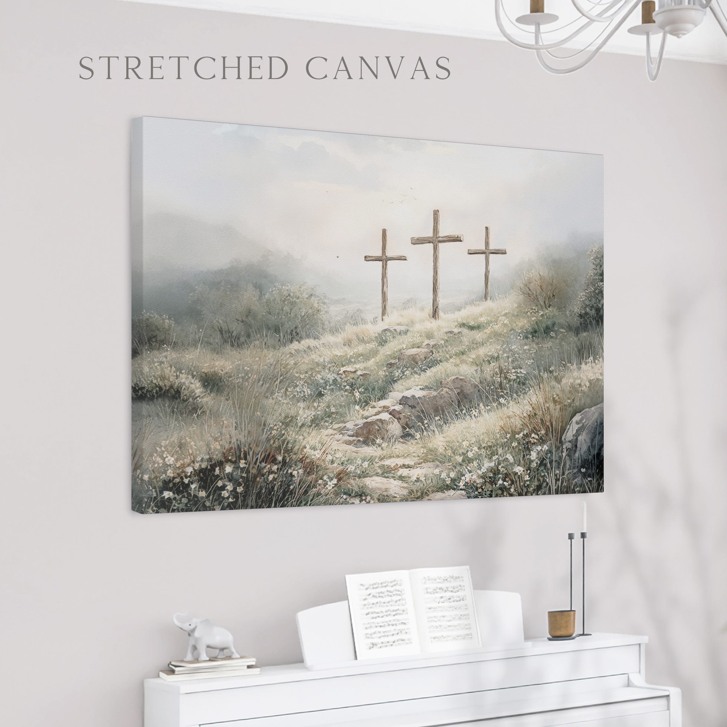 3 crosses design Christian wall art in a soft watercolor landscape. A timeless religious decoration symbolizing faith, sacrifice, and Easter reflection.