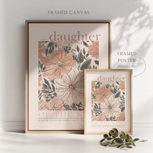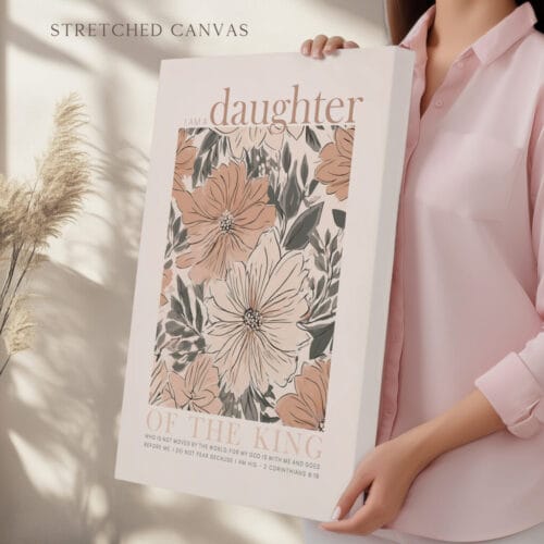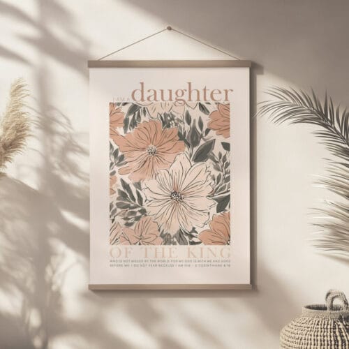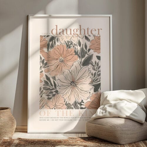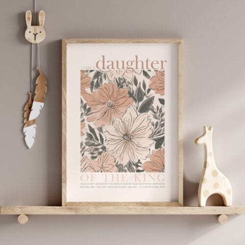 This inspiring Boho Christian Girl Nursery wall art features the powerful message from 2 Corinthians 6:18, reminding your daughter of her identity and God’s love. With gentle watercolor florals in sage green and peachy neutral tones, this Bible verse wall art radiates warmth and tenderness, perfect for your baby girl’s nursery or child’s bedroom.