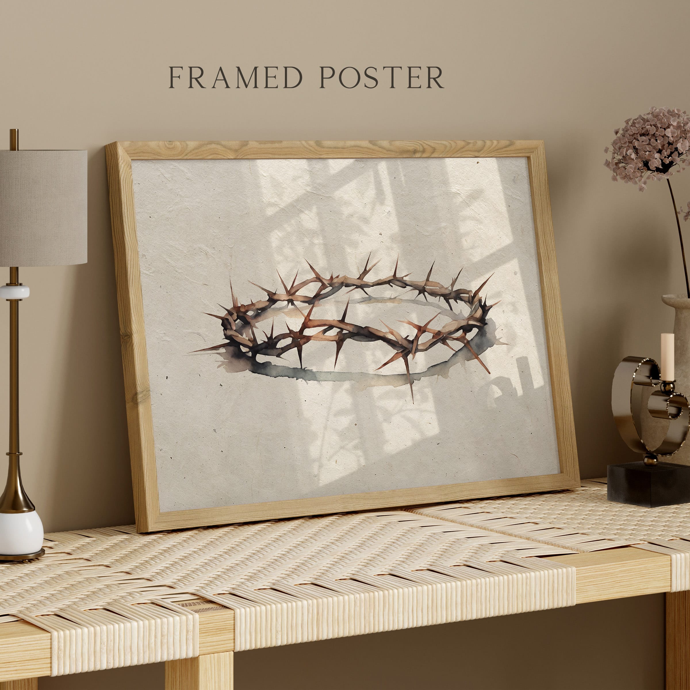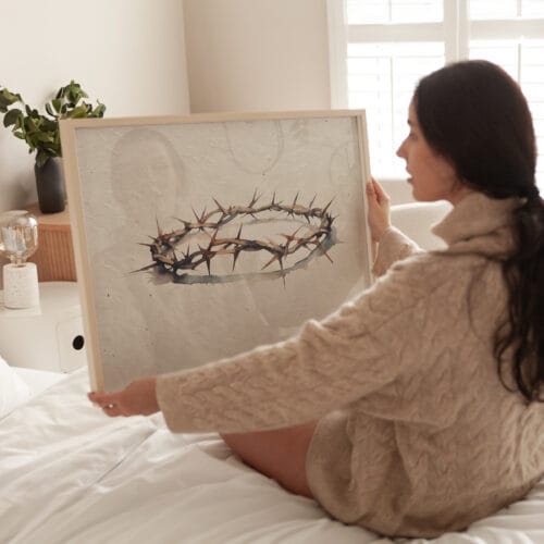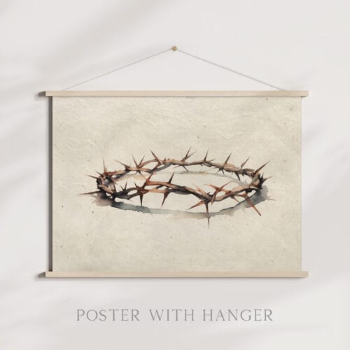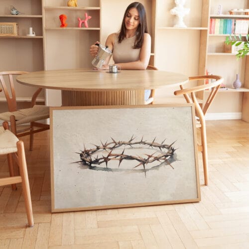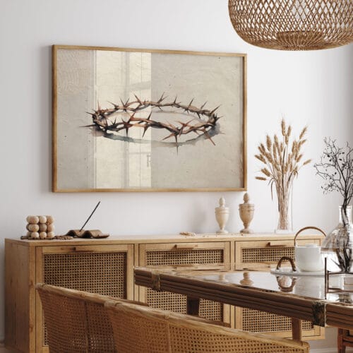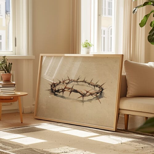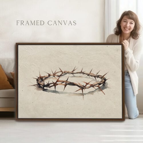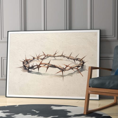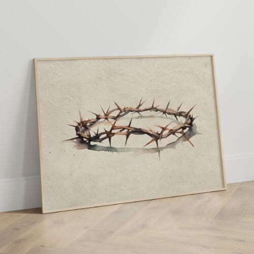 This crown of thorns Good Friday wall art is designed as a quiet meditation on Christ’s sacrifice and healing. Painted in a restrained Christian watercolor style, the textured background and softened shadows reflect the weight of the Crucifixion Lord God, echoing the truth of “by His wound we are healed” from Isaiah 53:5. It is a contemplative piece created for reflection rather than decoration alone.