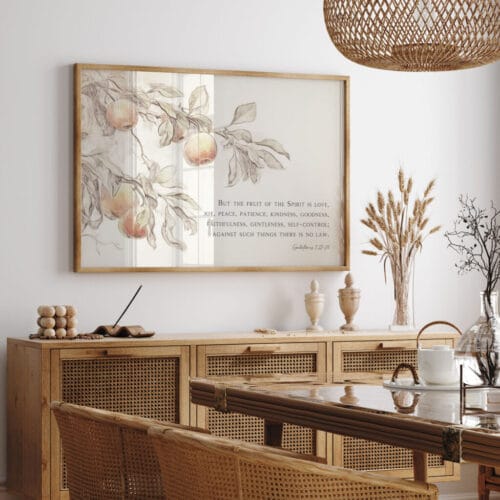 Embrace the virtues of Galatians 5:22-23 with this elegant Fruit of the Spirit wall art. This landscape-oriented religious watercolor artwork showcases a calming neutral boho palette and vintage-inspired design, creating a serene focal point that complements any home or sacred space.