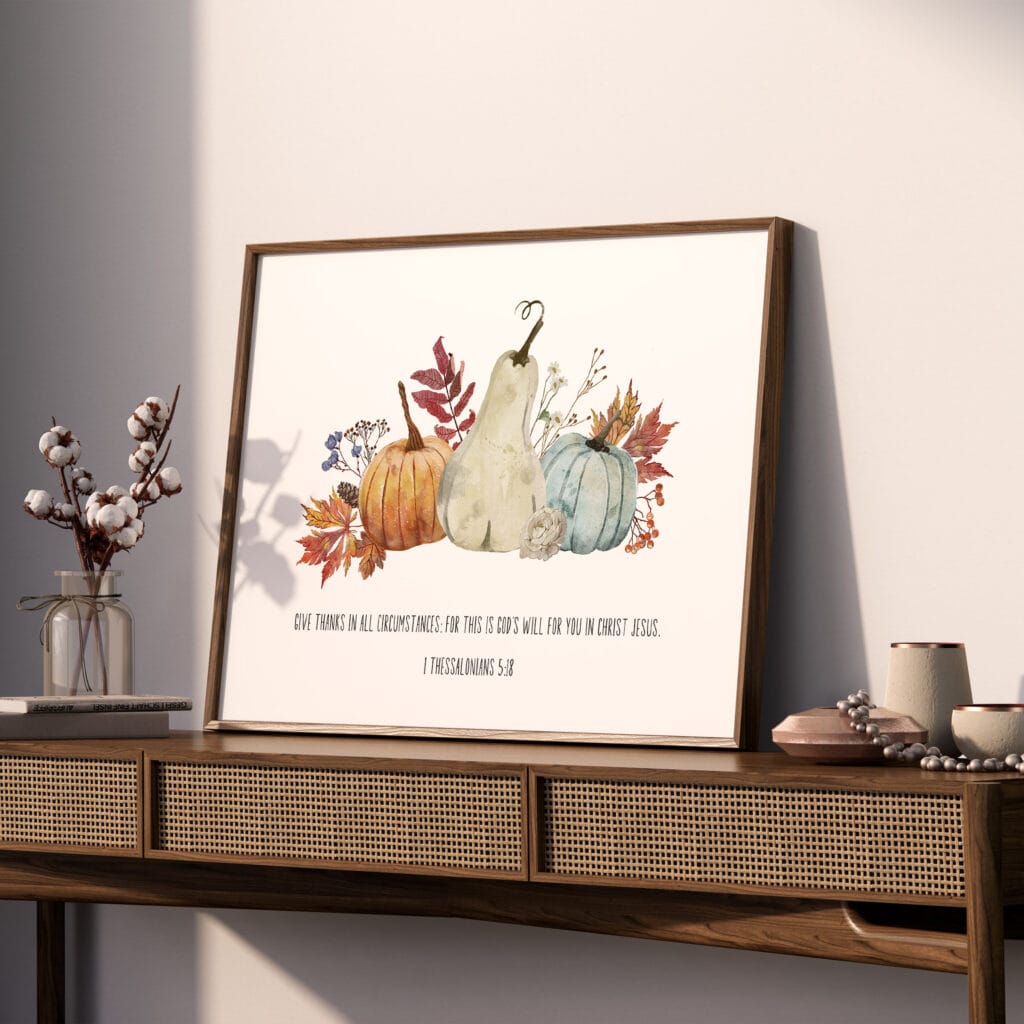 Celebrate the beauty of gratitude with this Give Thanks Scripture Print, featuring the uplifting words of 1 Thessalonians 5:18 — “In all things give thanks.” This heartfelt Bible verse wall art captures the essence of faith and thankfulness, making it a meaningful piece for your home.