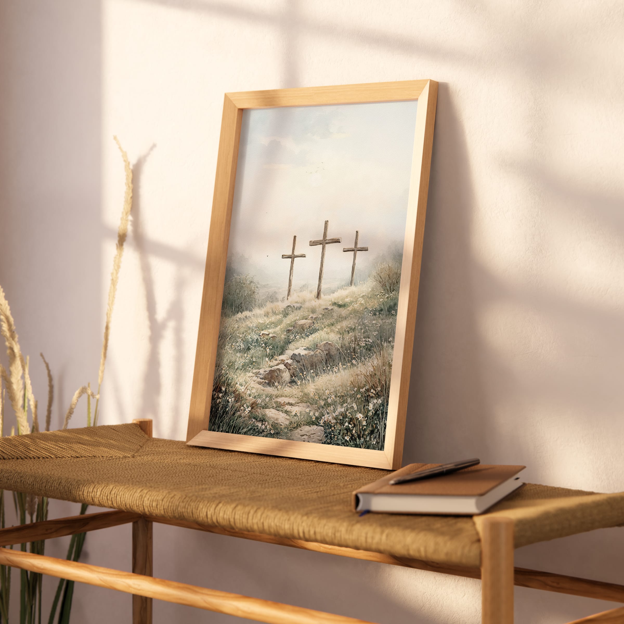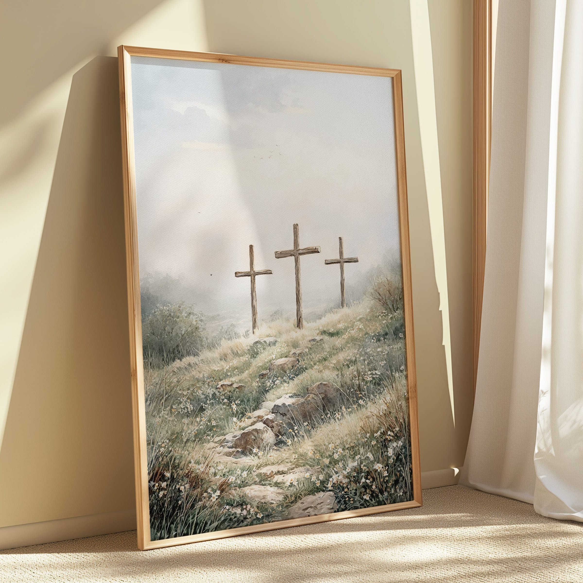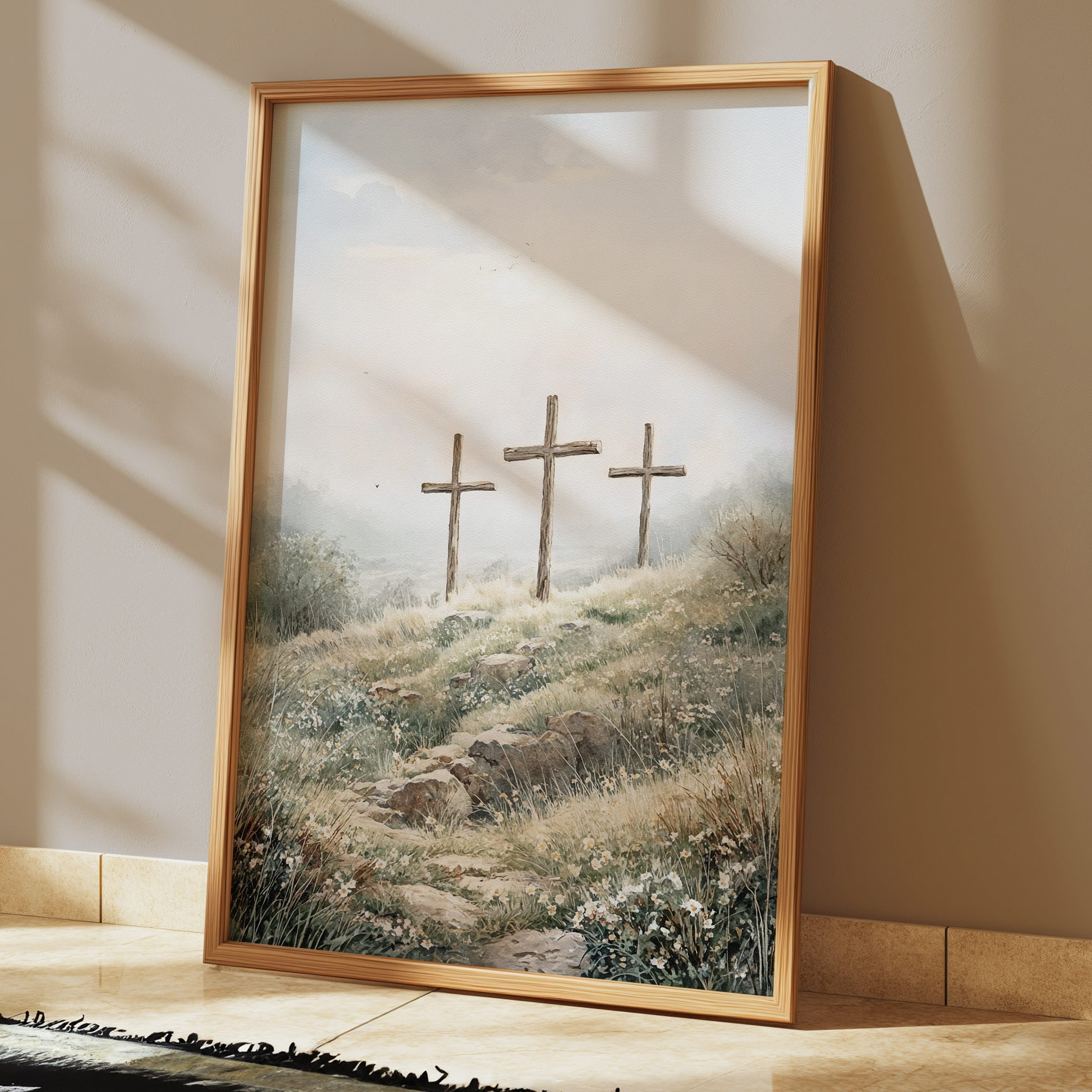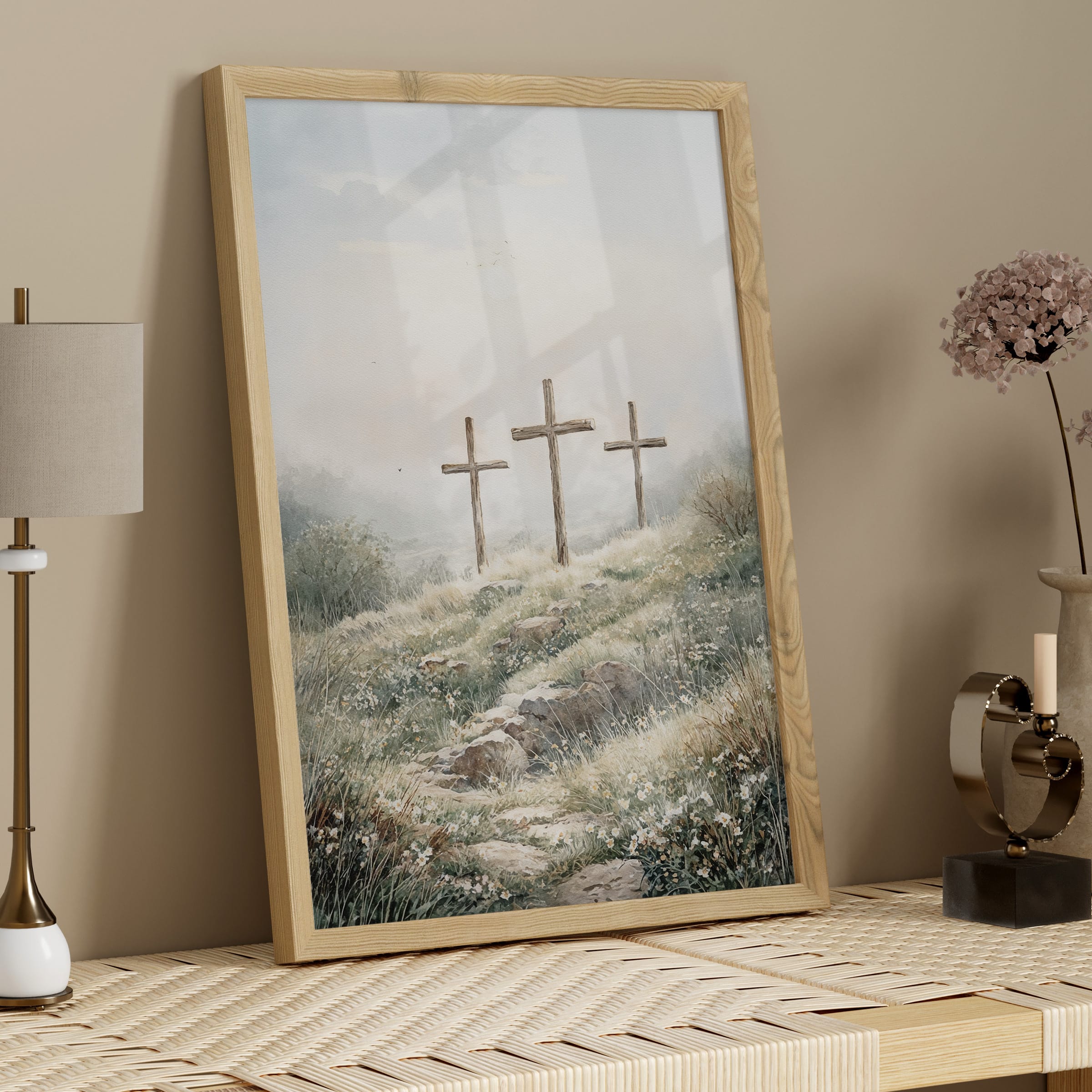 This good friday wall art is a reverent crucifixion painting set on Golgotha hill, portraying the sacrifice of Christian Jesus Lord through a calm, atmospheric watercolor landscape. Three weathered crosses rise above a quiet path, symbolizing God’s redemptive love and the promise of vintage resurrection hope. The illustration artwork balances Good Friday solemnity with Easter light, gently pointing toward the truth that He is risen.