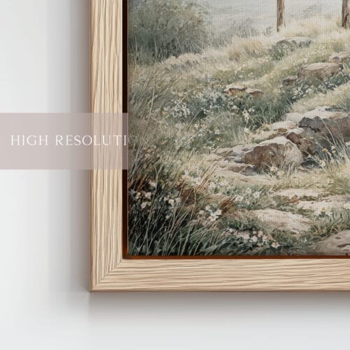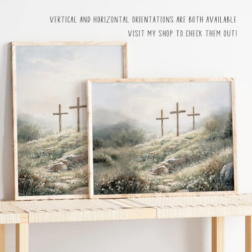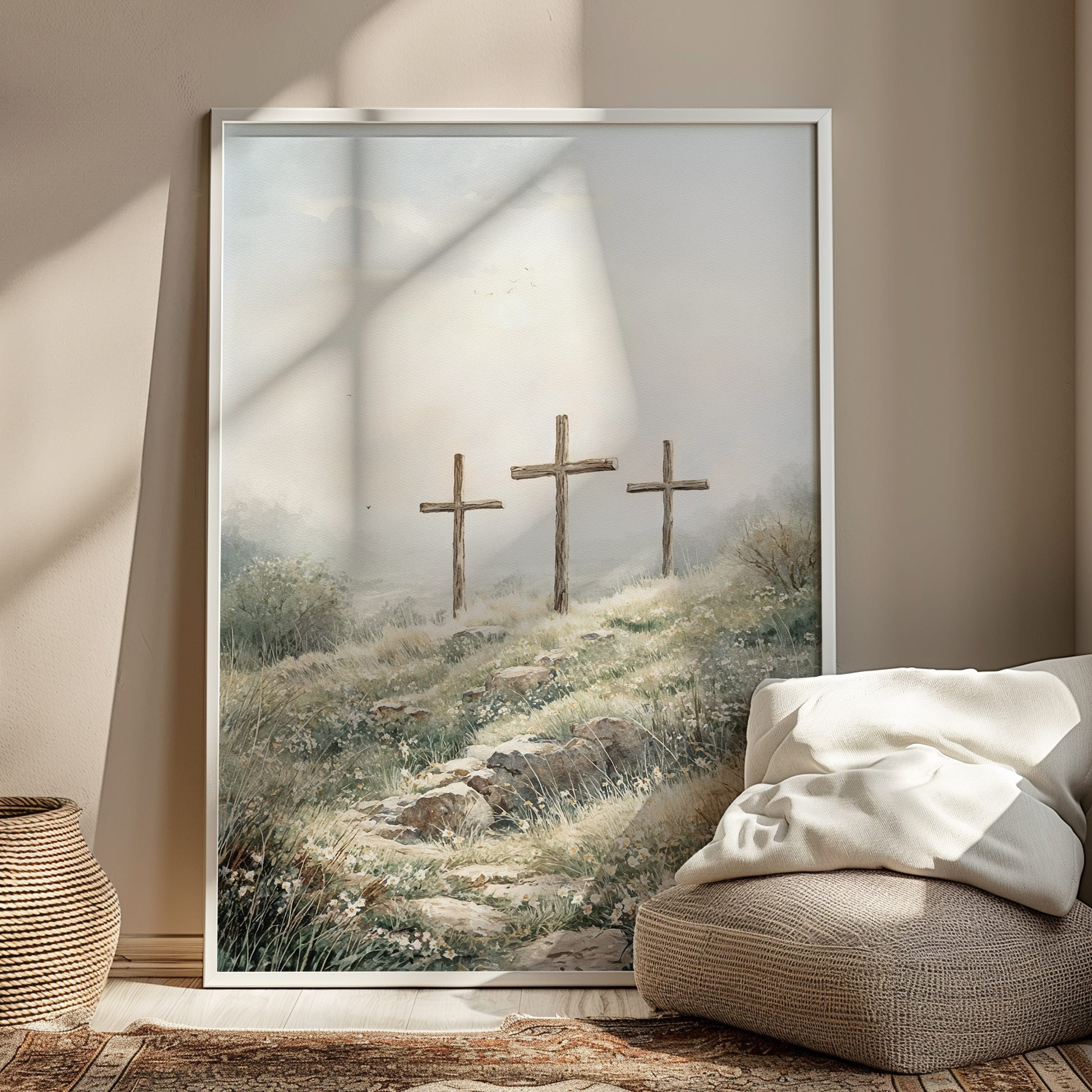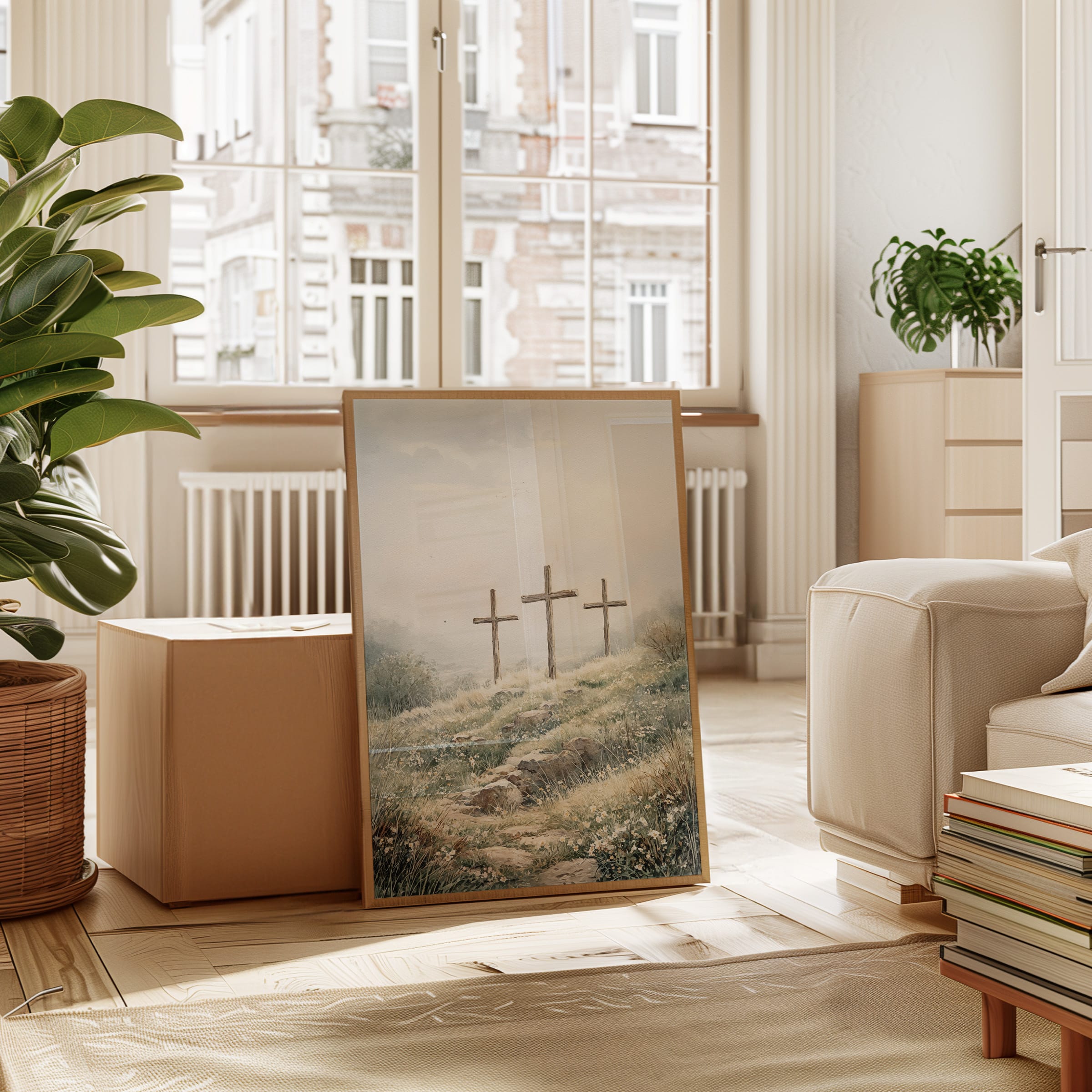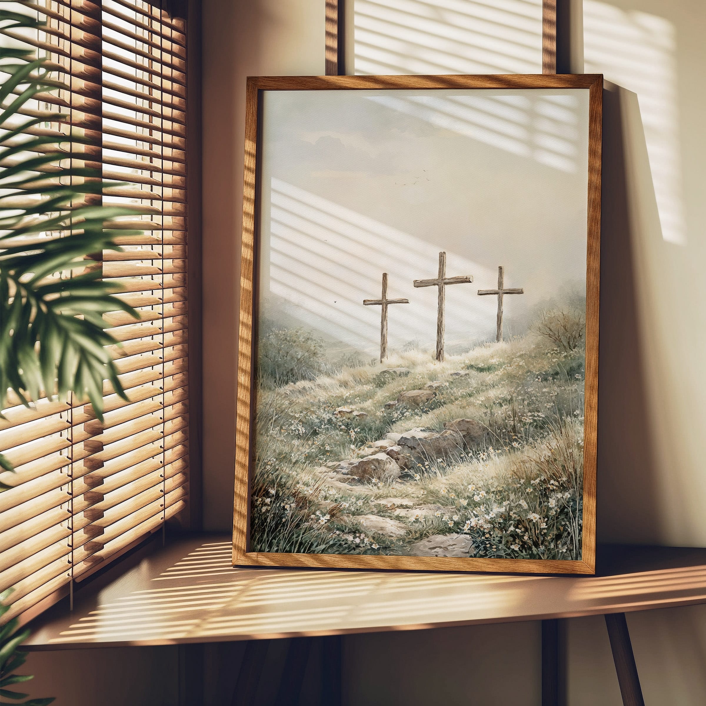 This good friday wall art is a reverent crucifixion painting set on Golgotha hill, portraying the sacrifice of Christian Jesus Lord through a calm, atmospheric watercolor landscape. Three weathered crosses rise above a quiet path, symbolizing God’s redemptive love and the promise of vintage resurrection hope. The illustration artwork balances Good Friday solemnity with Easter light, gently pointing toward the truth that He is risen.