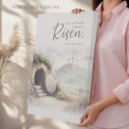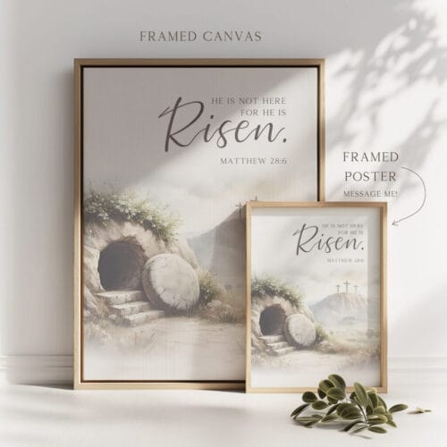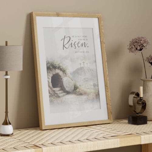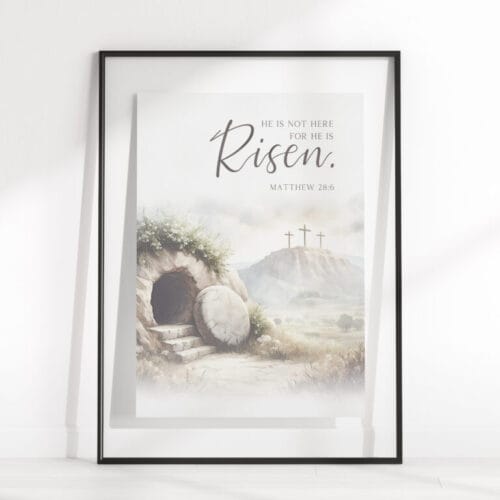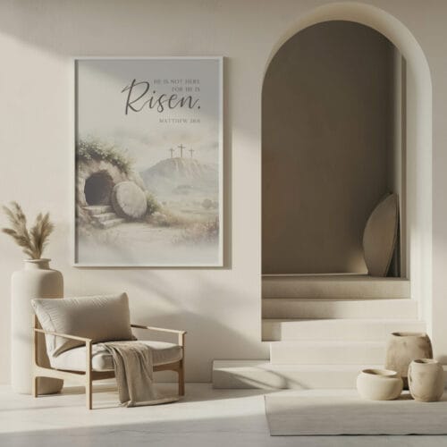 Bring the powerful message of Matthew 28:6 into your home with this He is risen wall art. This serene watercolor illustration captures the quiet beauty of the Jerusalem Garden Tomb, inviting you to reflect on the hope and triumph of the resurrection.