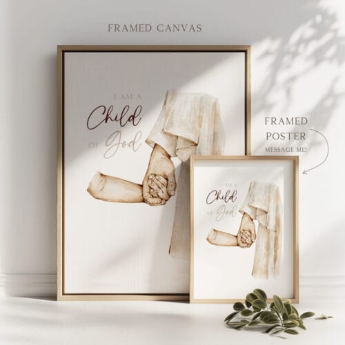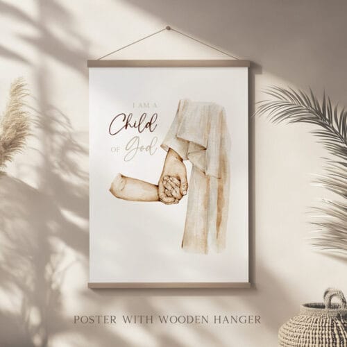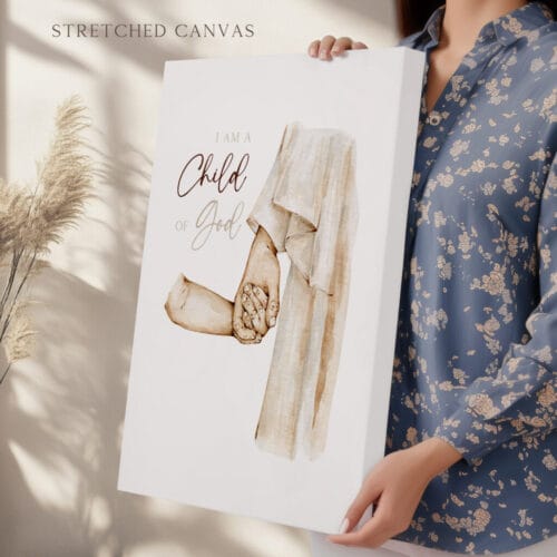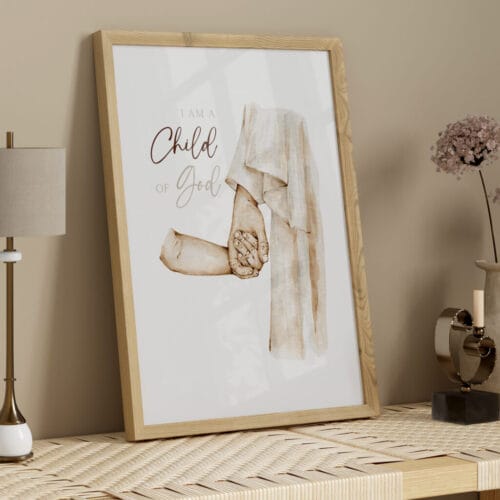 This minimalist “I Am a Child of God” wall art features a calming watercolor design of Jesus holding a child’s hand, perfect for Christian homes.