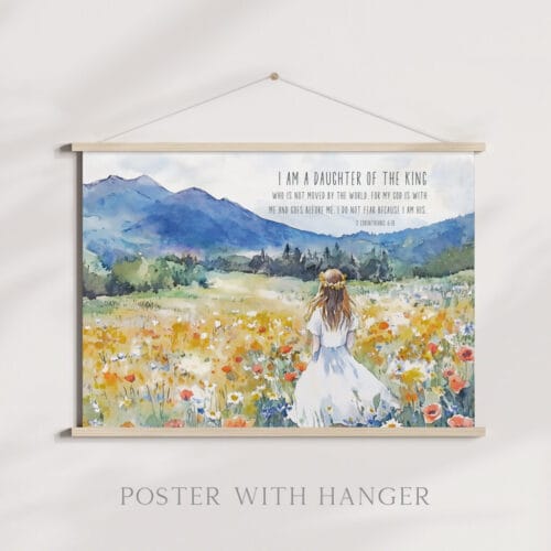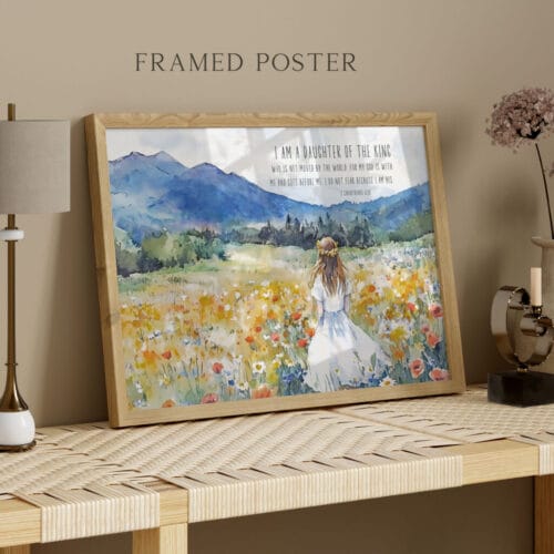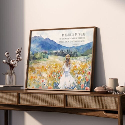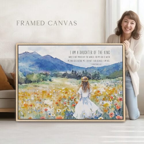 Celebrate your little girl’s identity in Christ with this tender and uplifting I am a Daughter of the King artwork. Set in soft boho watercolor tones and accented with delicate wildflower details, this piece is more than just nursery decor—it’s a declaration of her eternal worth and a daily affirmation of who she is in God’s eyes.