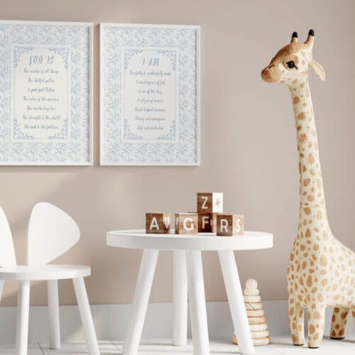 Each print in this set of two includes powerful scripture-based affirmations like “God Is” and “I Am,” reminding your child of their worth and identity in Christ. Verses like Psalm 139:14, “fearfully and wonderfully made,” and Joshua 1:9, “strong and courageous,” offer hope and truth in every glance.