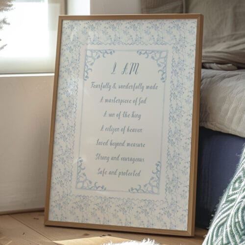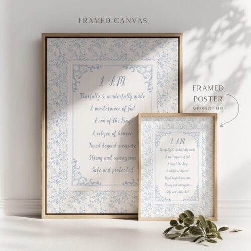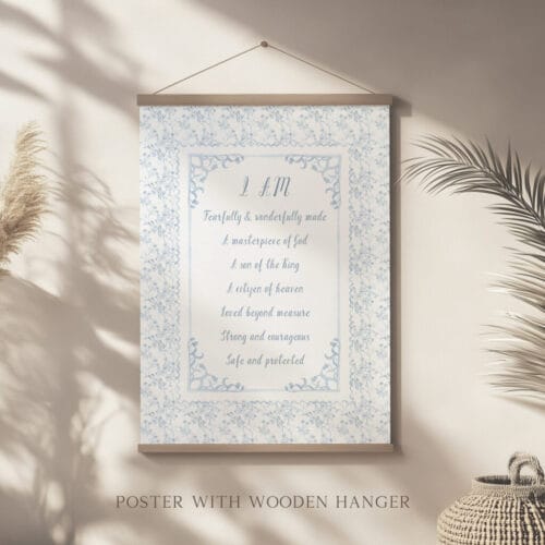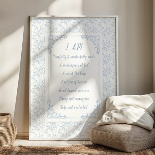 Designed with a soft cottagecore and Grandmillennial aesthetic, these prints are perfect for baby dedication gifts, baptisms, or simply creating a comforting and inspiring nursery. From a baby boy’s nursery to a young boy or teen’s room, these prints speak love, hope, and strength.