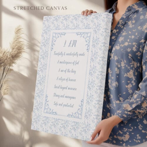 Bring a gentle, faith-filled beauty to your little one’s nursery with this pastel blue Identity in Christ boy nursery wall art set. These charming prints feature delicate watercolor floral borders and Christian affirmations, creating a warm and meaningful space for your son or young boy.