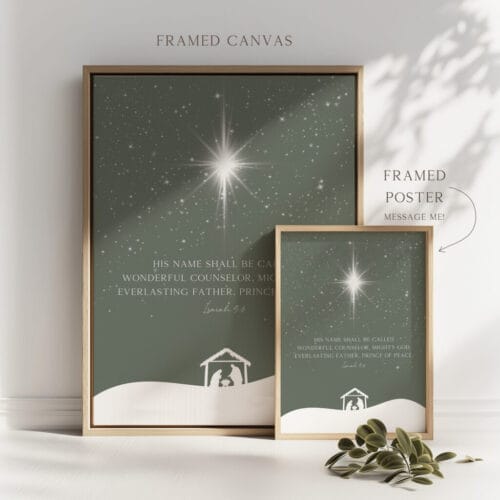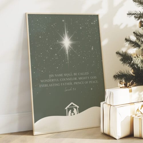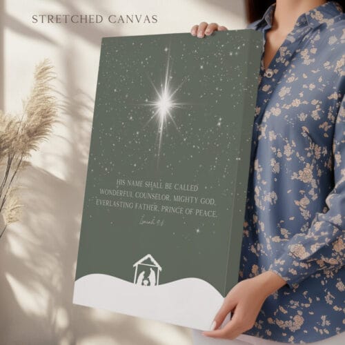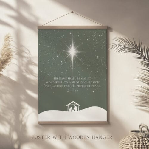 Celebrate the season with Isaiah 9:6 Minimalist Christmas wall art featuring a nativity scene, sage green tones, and powerful scripture for home or church decor.