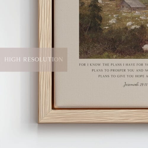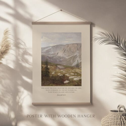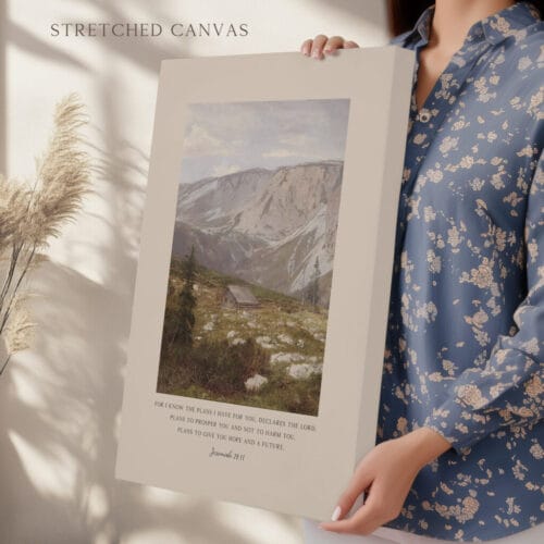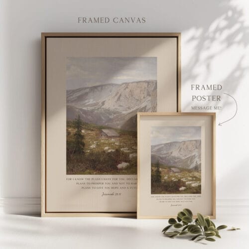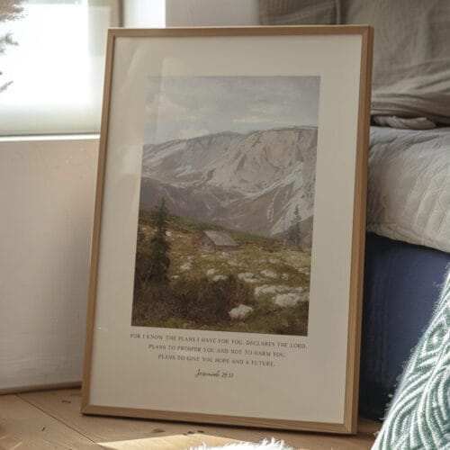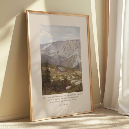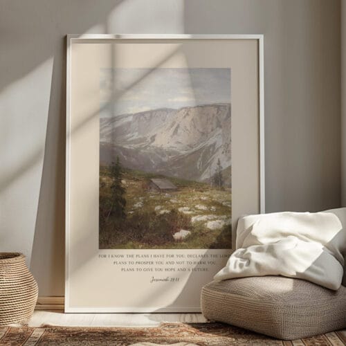 Surround yourself with the reassuring words of Jeremiah 29:11: “For I know the plans I have for you…” This stunning Bible verse wall art pairs a beloved Scripture with a tranquil vintage landscape oil painting, evoking peace, trust, and purpose. The gentle mountain scene and painterly textures create an atmosphere of calm, perfect for grounding your home in faith and beauty.