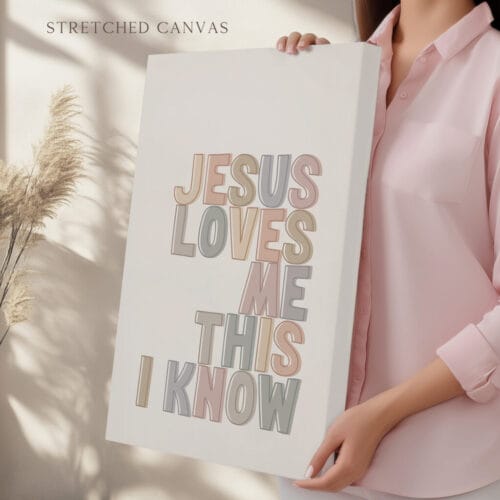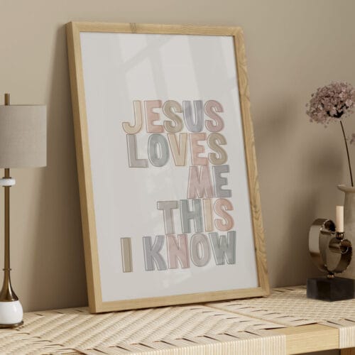 This Jesus Loves Me This I Know nursery wall art captures the timeless truth of God’s love with a soft, pastel color palette and modern Christian typography. A perfect match for boho or contemporary nurseries, this artwork gently affirms what every child needs to hear—Jesus loves them.