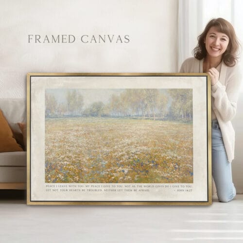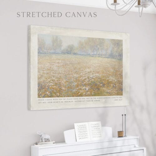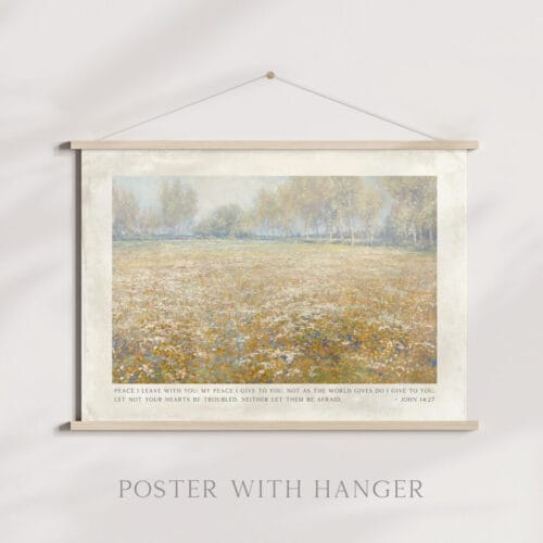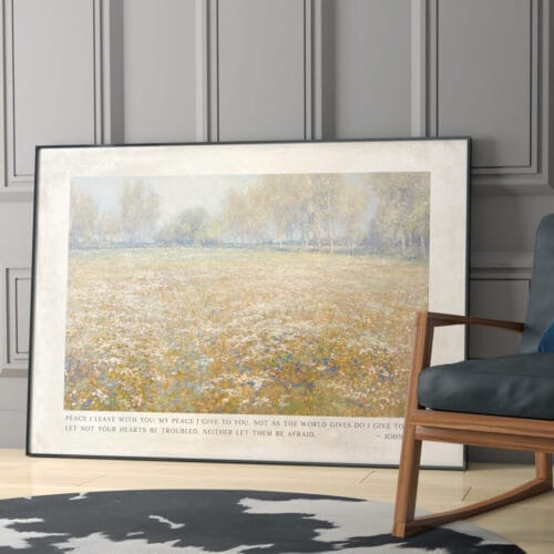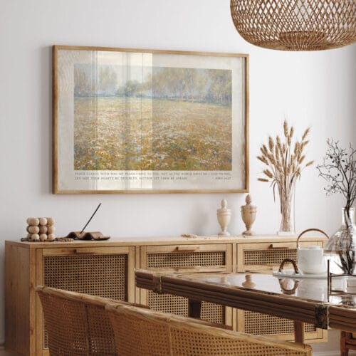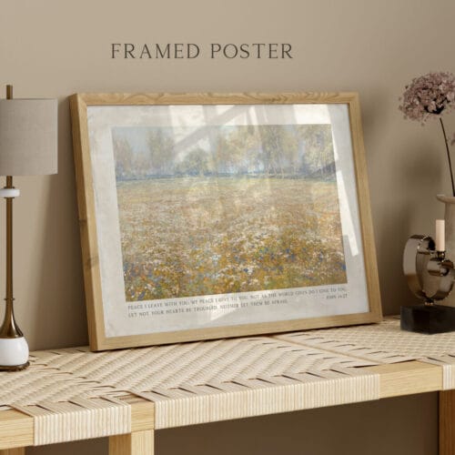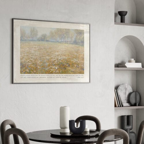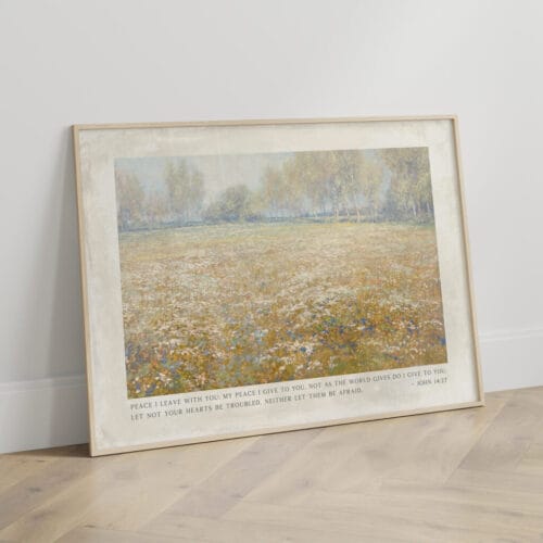 Bring peace to your home with this John 14:27 Bible Verse Wall Art. A printable vintage floral field artwork featuring the comforting Scripture quote.