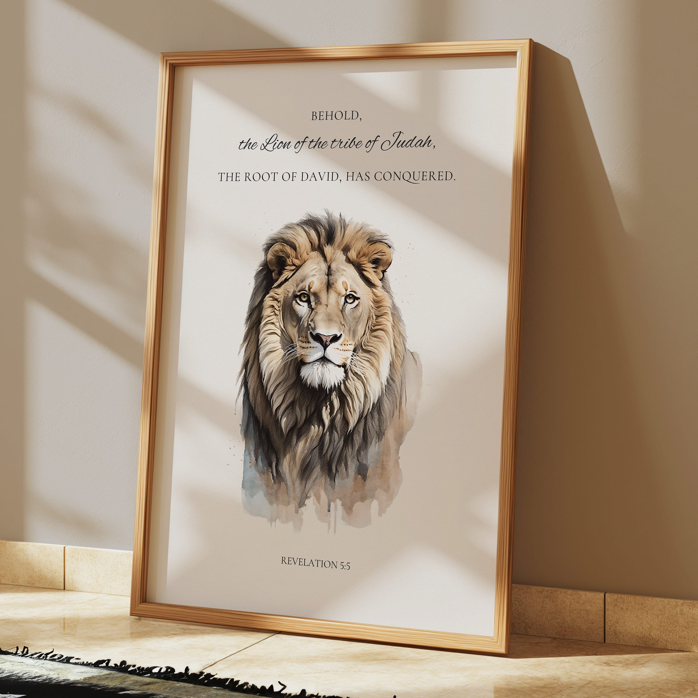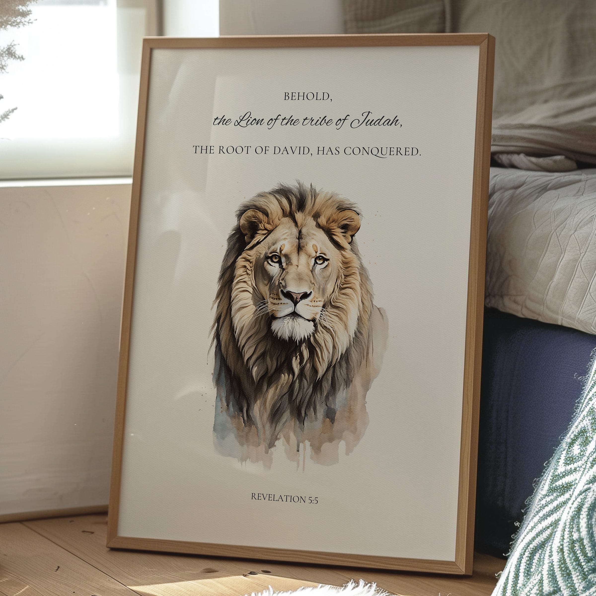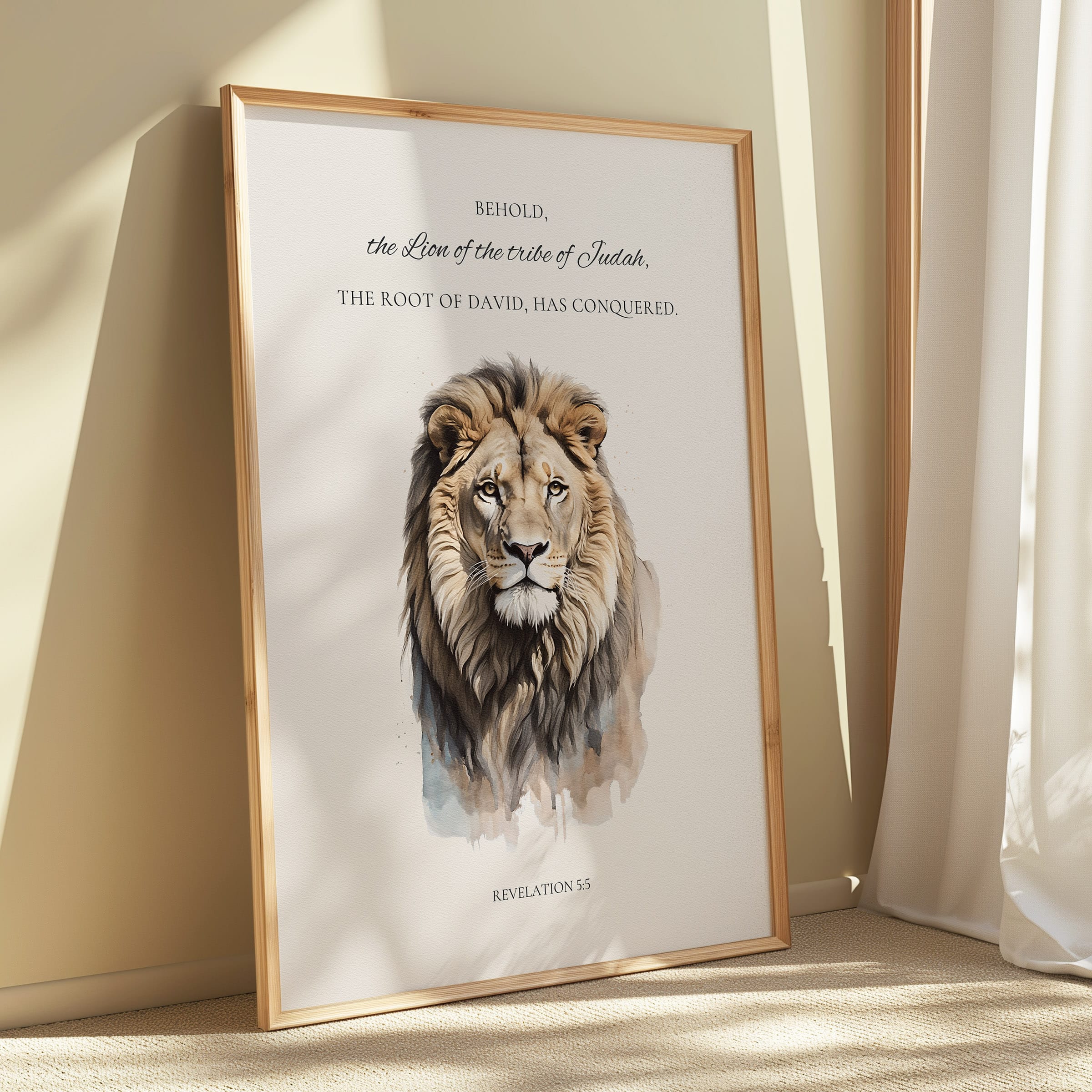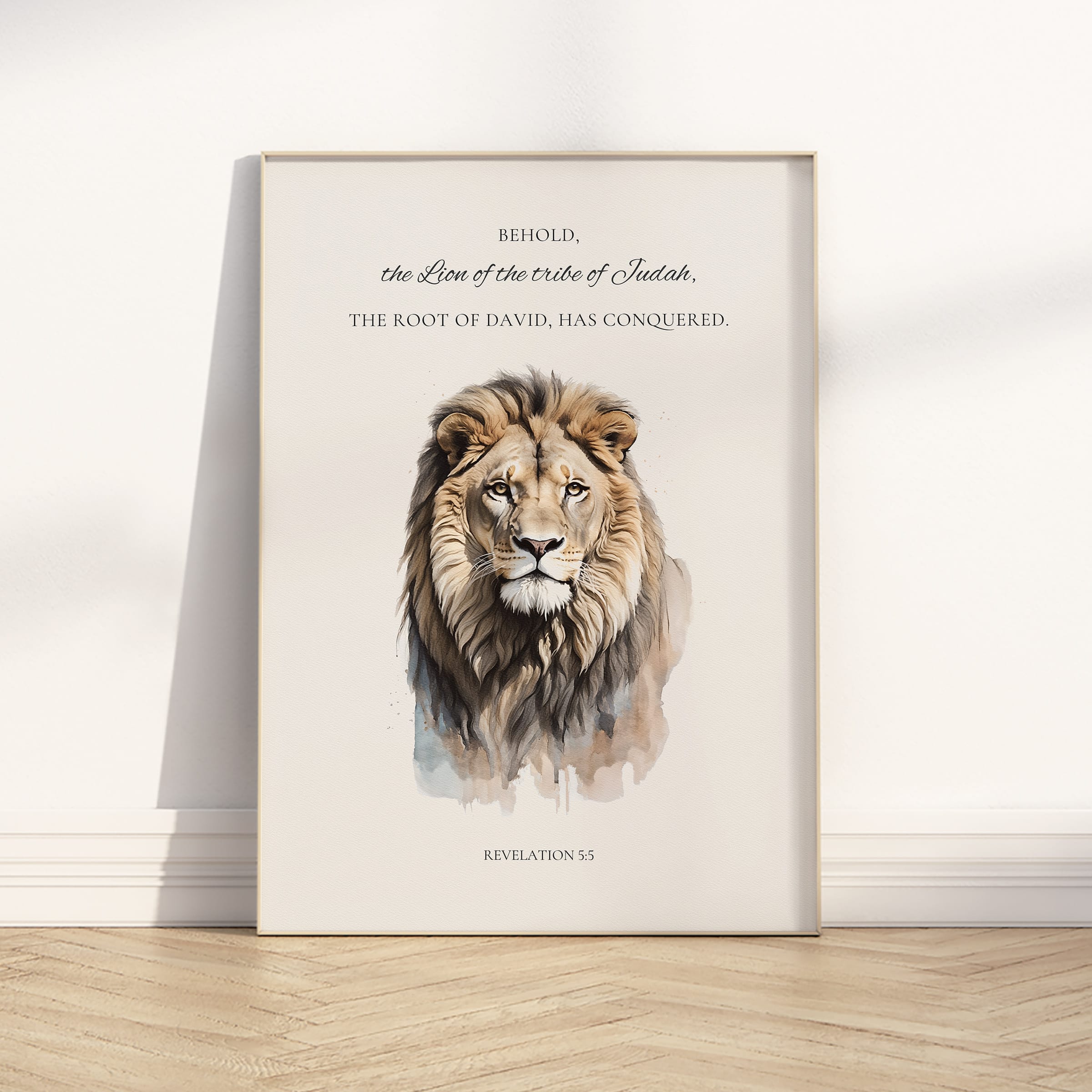 This Lion of Judah wall art is a reverent illustration artwork inspired by Revelation 5:5, capturing the strength, authority, and hope found in the words “Behold, the Lion of the tribe of Judah.” Painted in a gentle prophecy watercolor style, the lion’s expression is calm yet powerful, reflecting the victorious nature of Christ and the fulfillment of God’s promise. Soft earth-tone hues and layered brush textures give the artwork a timeless, fine-art quality that feels both sacred and approachable.