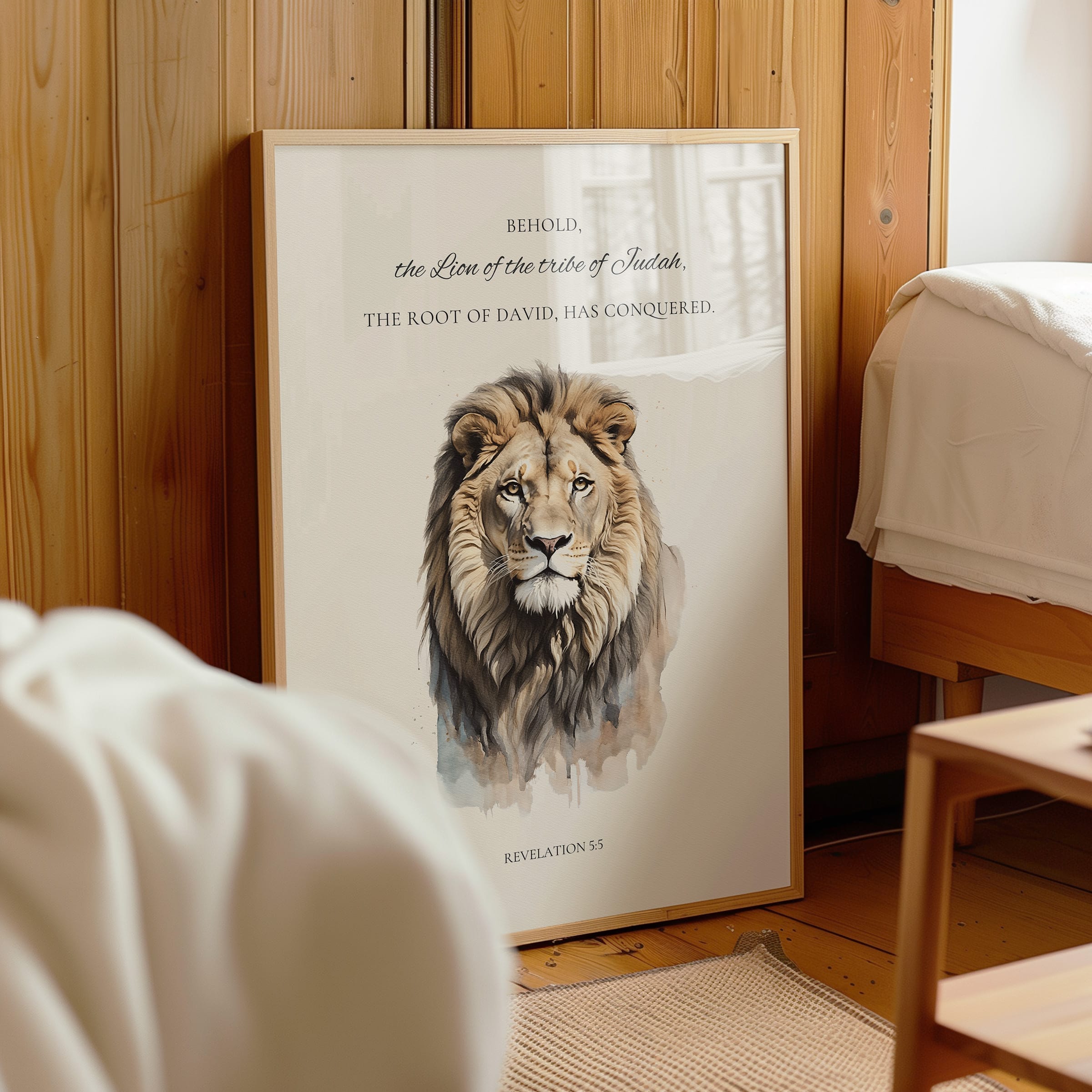 Designed as meaningful Bible verse wall art, this piece works beautifully as scripture home decor in living rooms, prayer corners, bedrooms, or entryways. It is also well-suited for church Sunday school, study rooms, and worship spaces, where visual reminders of faith and prophecy can encourage reflection. The minimalist composition allows the Revelation 5:5 quote to stand out without overwhelming the space.