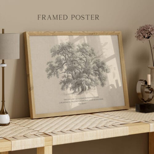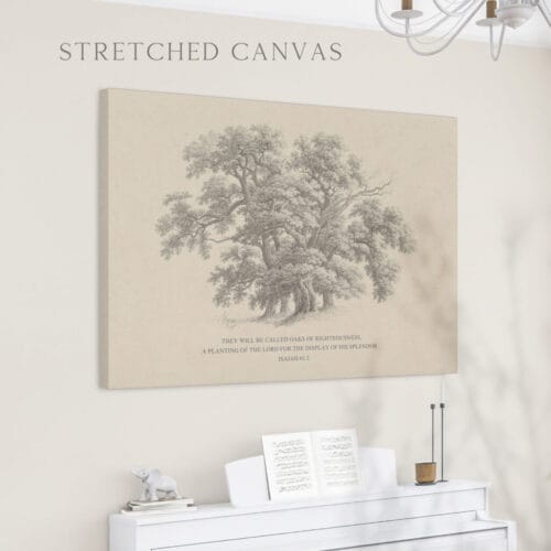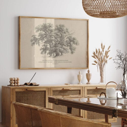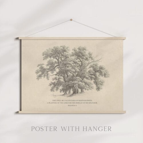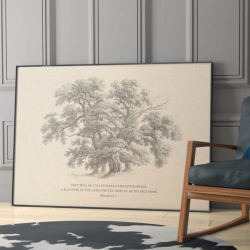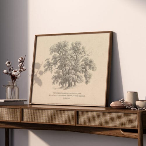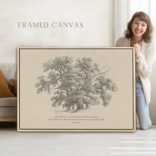 This design incorporates a hand-drawn vintage oak tree — a nod to nature’s enduring beauty and spiritual symbolism. The beige parchment-like background and soft textures create a timeless look that complements both rustic and modern decor styles. Whether displayed in your living room, hallway, prayer nook, or office, it serves as a daily visual encouragement of who we are in Christ: oaks of righteousness.