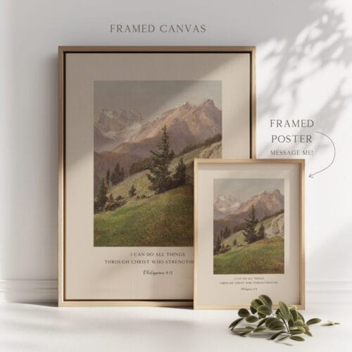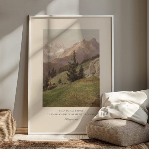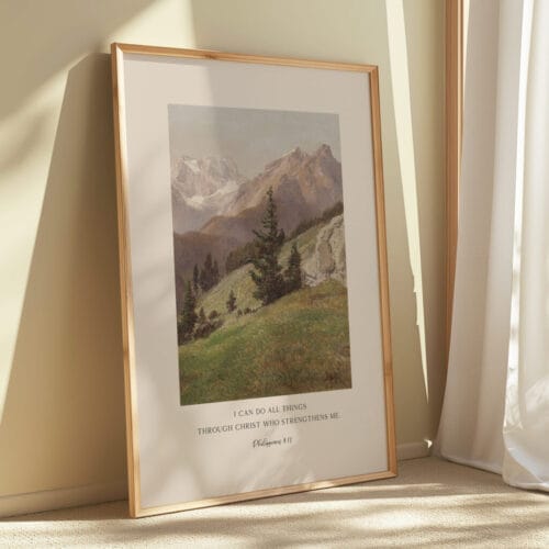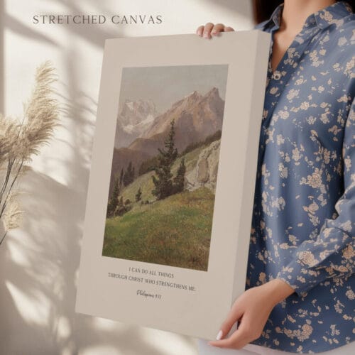 Let Scripture speak strength into your heart with this Philippians 4:13 wall art, featuring the beloved verse: “I can do all things through Christ who strengthens me.” Set against a vintage oil painting landscape of soft mountains and skies, this piece infuses classic beauty with unwavering faith.