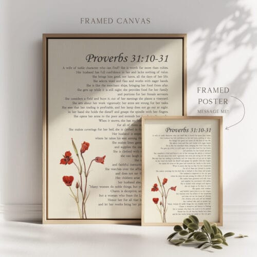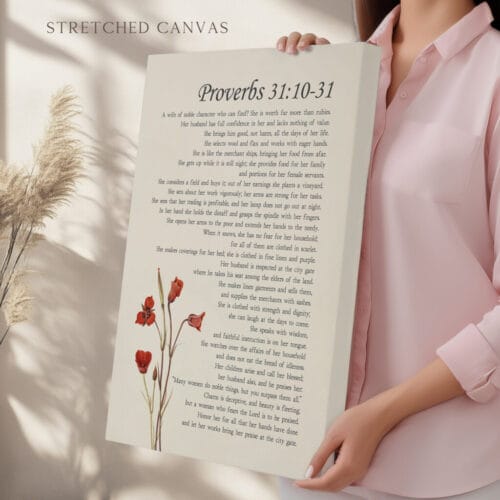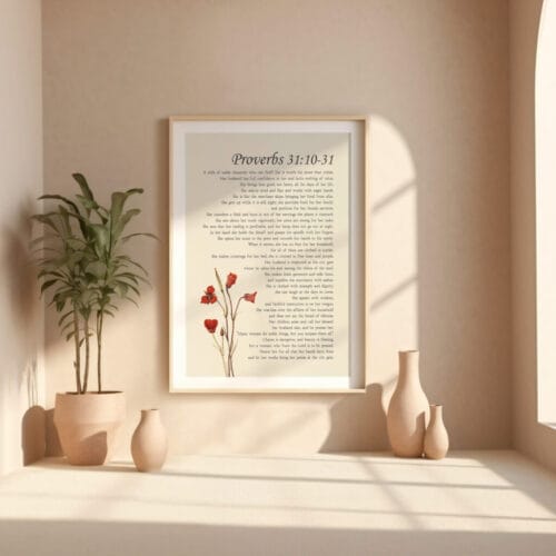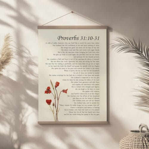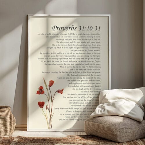 Celebrate with this vintage floral Proverbs 31 woman wall art. A graceful Christian scripture print honoring strength, dignity, and timeless beauty.