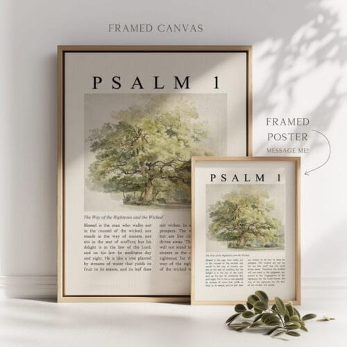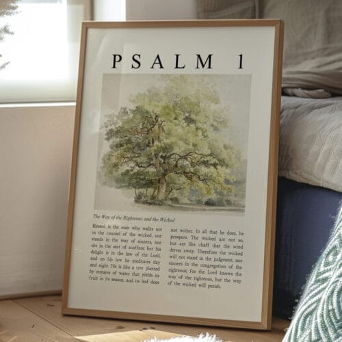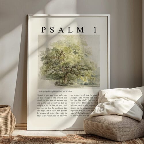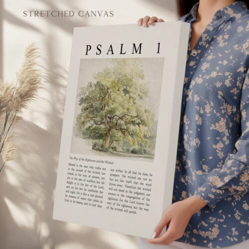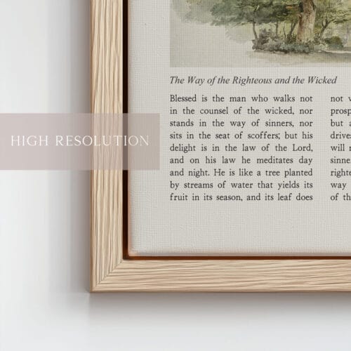 This Psalm 1 wall art brings vintage beauty and biblical truth together in a serene and inspiring design. Featuring the verse “He shall be like a tree planted by the rivers of water,” this restored Christian watercolor illustration evokes a sense of strength, peace, and spiritual rootedness.