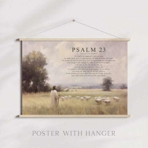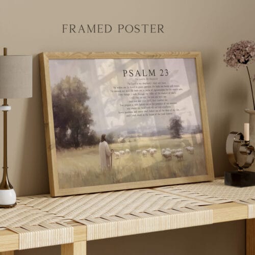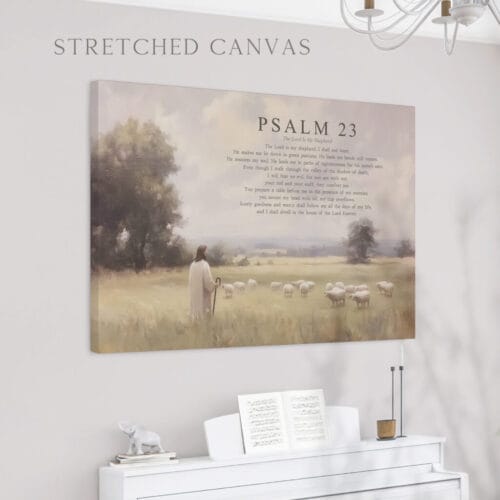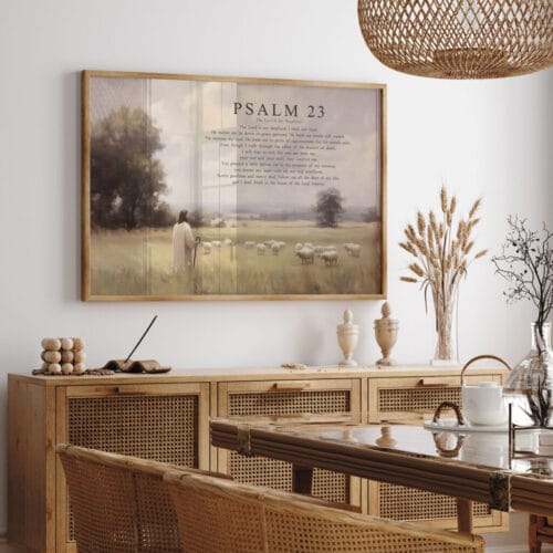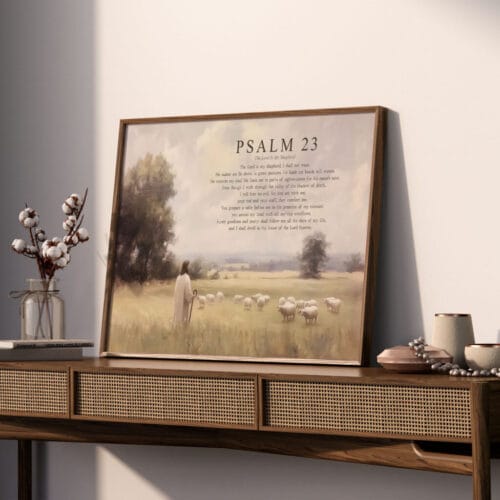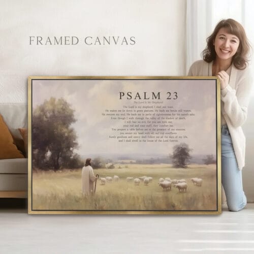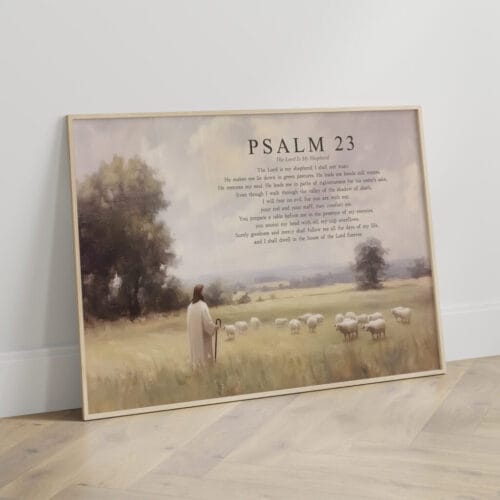 Bring the quiet strength of scripture into your home with this Psalm 23 The Lord is my Shepherd wall art. This vintage oil painting illustration captures Jesus walking alongside His flock through sun-drenched meadows and still waters, echoing the gentle promise of peace and protection in every brushstroke.
