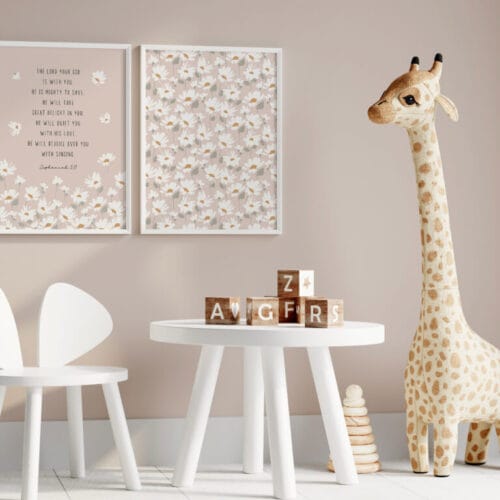 This set of 3 Christian nursery wall art prints centers around the comforting promise of Zephaniah 3:17: