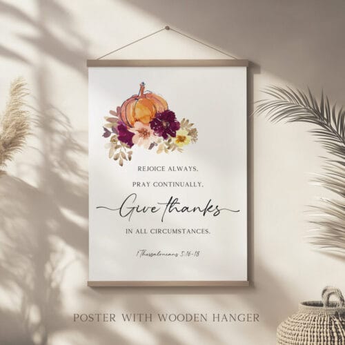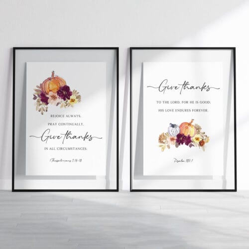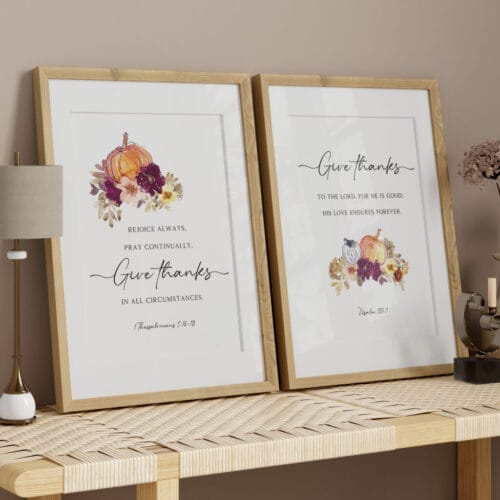 Bring the warmth of the season into your home with this Thanksgiving Scripture Print set, featuring two autumn-inspired Bible verse designs. The first highlights 1 Thessalonians 5:16-18 with the uplifting call to “Rejoice always, pray continually, give thanks in all circumstances”, while the second showcases Psalm 107:1, celebrating God’s enduring goodness and love.