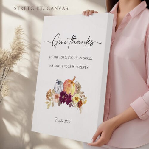 Designed with both seasonal charm and lasting inspiration, this set pairs perfectly in dining rooms, entryways, church Sunday school spaces, or a homeschool classroom. The fall botanical print details, warm harvest palette, and heartfelt scripture combine to create a Thanksgiving artwork display that uplifts any space.